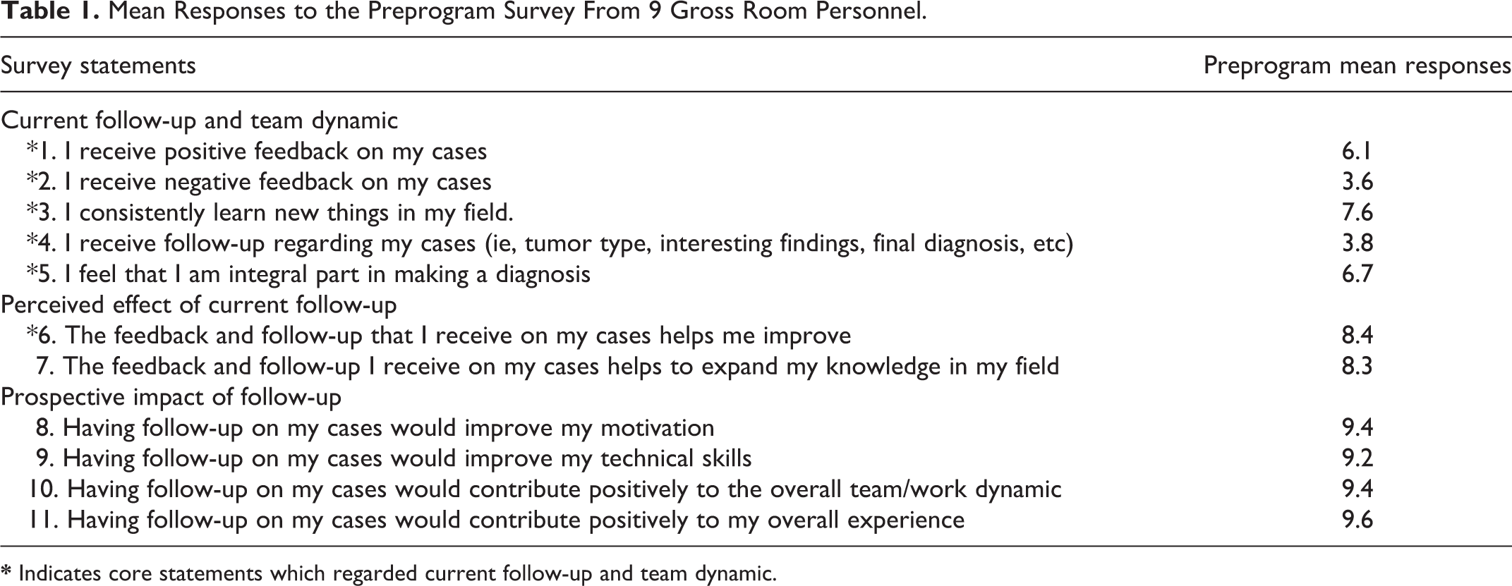 The study commenced with survey distribution to assess the need for our program. The sample population included 13 GRP employed at the Hospital of the University of Pennsylvania. Two of the GRP were pathologist technicians/technologists and 11 were PAs. We created a survey containing 11 statements (Table 1), which were scored on a scale from 1 to 10, with 1 being “strongly disagree” and 10 being “strongly agree.”1 The survey statements were intentionally subjective in nature in order to gauge the current atmosphere in the gross room. Statements 1 to 5 assessed topics of current follow-up and team dynamic, statements 6 and 7 assessed perceived effect of current follow-up, and statements 8 to 11 assessed the prospective impact of case follow-up. The surveys were anonymous, but unique identifiers were created for future pairing of data to evaluate statistical changes. Unique identifiers were created as four digits, with the first two digits being date of birth and the last two digits being the last two digits of their phone number.