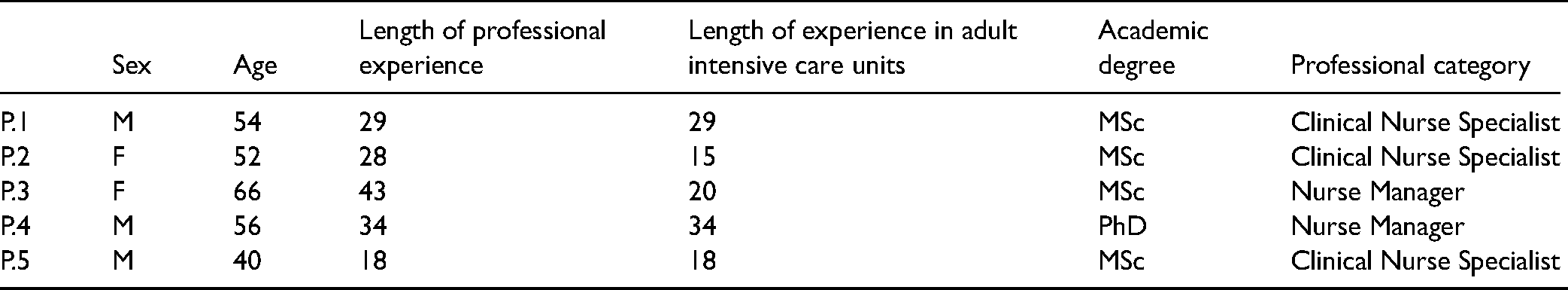 A total of five nurses (Table 1) participated in the study, three men and two women. The nurses’ age ranged between 40 years and 66 years (mean = 54.2; median = 54; standard deviation = 9.6). The length of professional experience ranged from 18 years to 43 years (mean = 30.4 years; median = 29; standard deviation = 9.12). The length of experience in the adult intensive care units ranged from 18 years to 34 years (mean = 23.2; median = 20; standard deviation = 7.98).