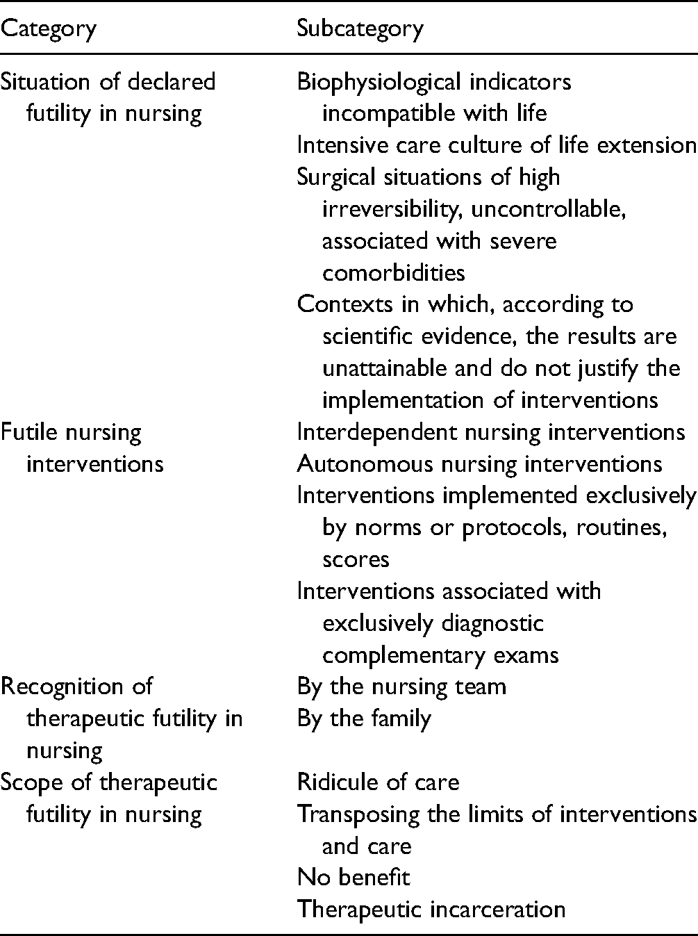 Initially, some difficulty was recognized on the part of the participants in identifying elements to characterize the extent and scope of therapeutic futility in nursing, including some reservations when nurses were asked to present suggestions for terms/associated terminology to this conception. From the responses presented by the participants, four subcategories are recognized, particularly, ridicule of care, transposition of the limits of intervention and care, lack of benefit, and therapeutic incarceration.