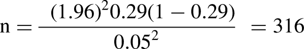The sample size was calculated using a single population proportion formula, considering the following assumptions: confidence level = 95%, critical value (Zα/2) = 1.96 and degree of precision (d) = 0.05, with a proportion (p) of 0.29 (Argaw et al., 2019). A 4% contingency for possible nonresponse was considered.
