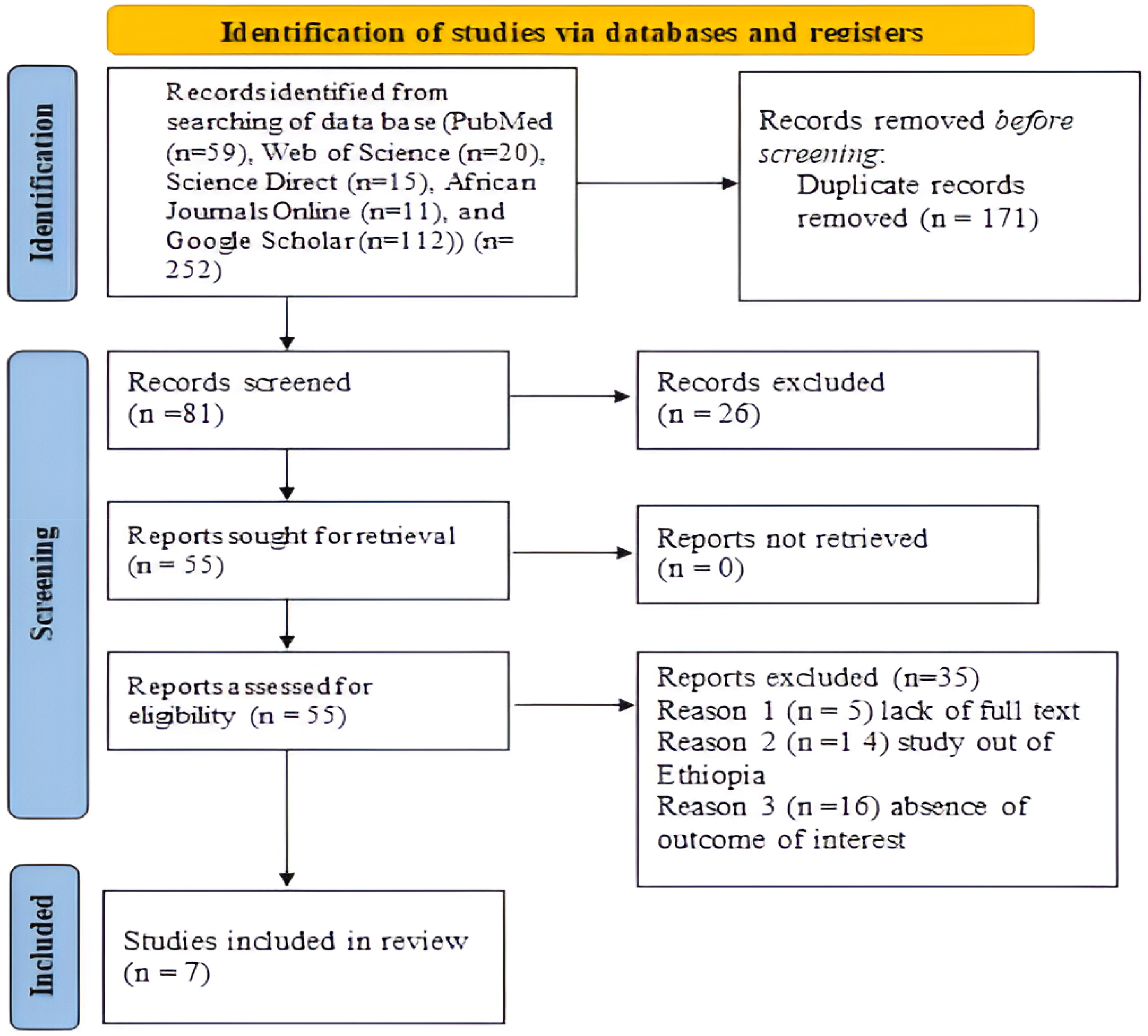 A total of 252 articles were initially identified through database searches. After removing 171 duplicates and 26 articles irrelevant title and abstracts 55 studies remained for further screening. Of these, 35 were excluded because they were conducted outside Ethiopia, lacked full-text access, and did not report the outcome of interest. Ultimately, seven studies met the eligibility criteria and were included in the final systematic review and meta-analysis (Figure 1).