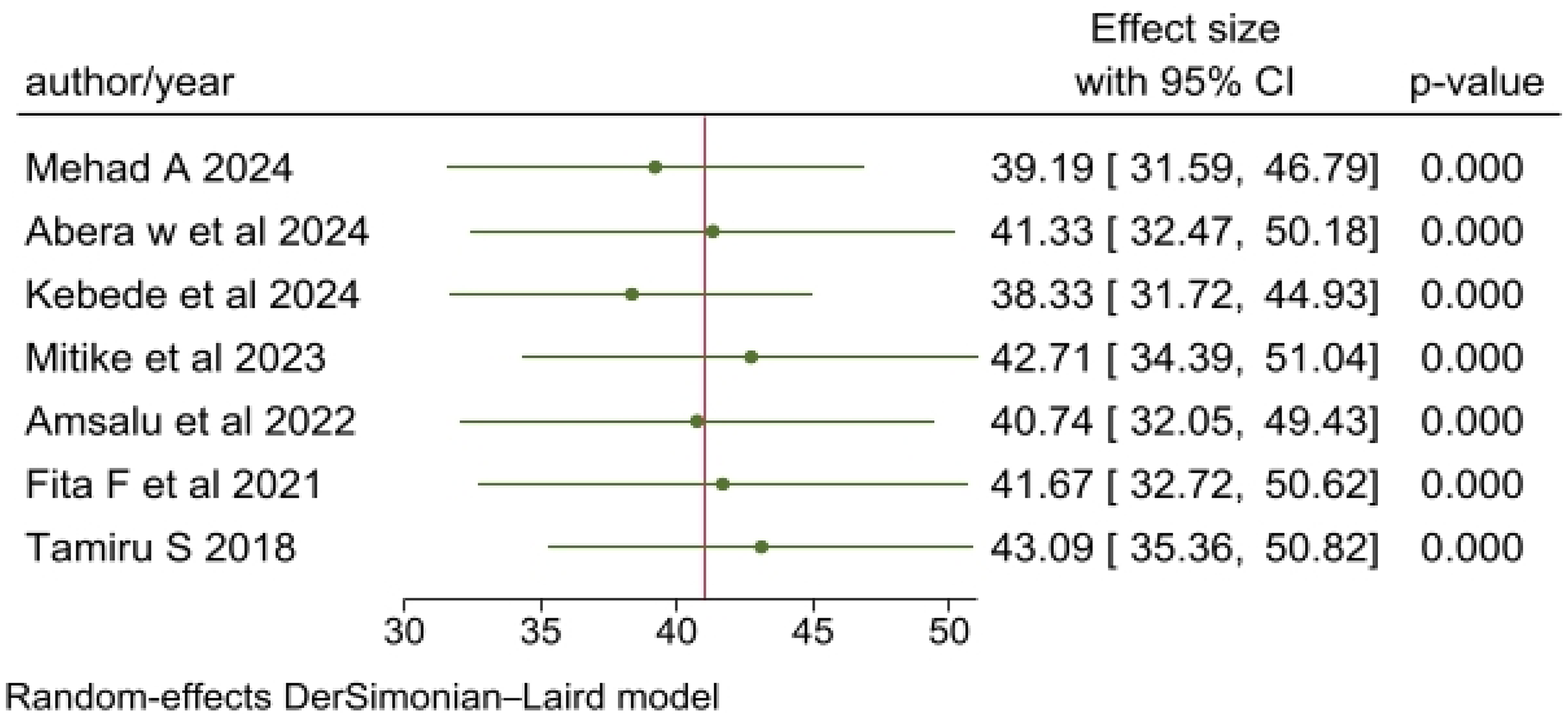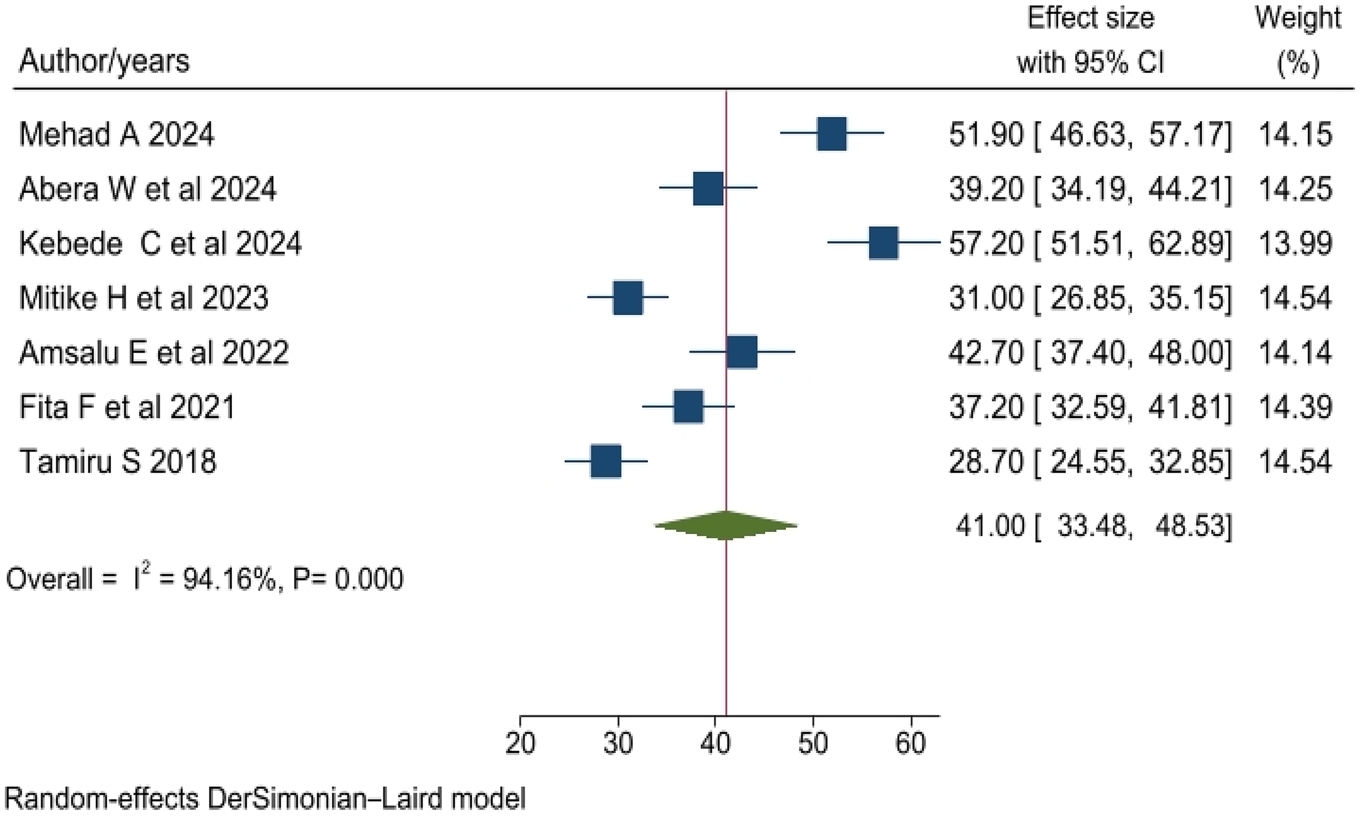 The pooled prevalence of nurses’ knowledge toward geriatric care in Ethiopia was 41.0% (95% CI: 33.48–48.53), with significant heterogeneity observed across studies (I² = 94.16%, p < 0.001) (Figure 2).