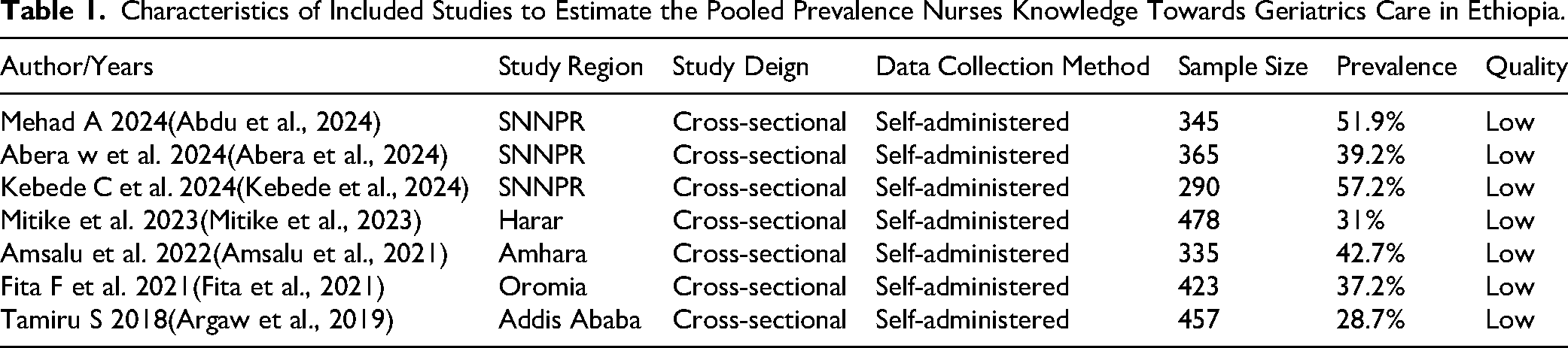 A total of seven studies were included to determine the pooled prevalence of knowledge and its associated factors among nurses regarding geriatric care in Ethiopia. All included studies employed a cross-sectional design, with a combined sample size of 2,693 participants. Three of the studies were conducted in the Southern Nations, Nationalities, and Peoples’ Region (SNNPR) (Abdu et al., 2024; Abera et al., 2024; Kebede et al., 2024), ones in Addis Ababa (Argaw et al., 2019), one in the Amhara region (Amsalu et al., 2021), one in the Oromia region (Fita, Mekonnen, Endalew & Azagew, 2021), and one in Harar (Mitike et al., 2023) (Table 1).