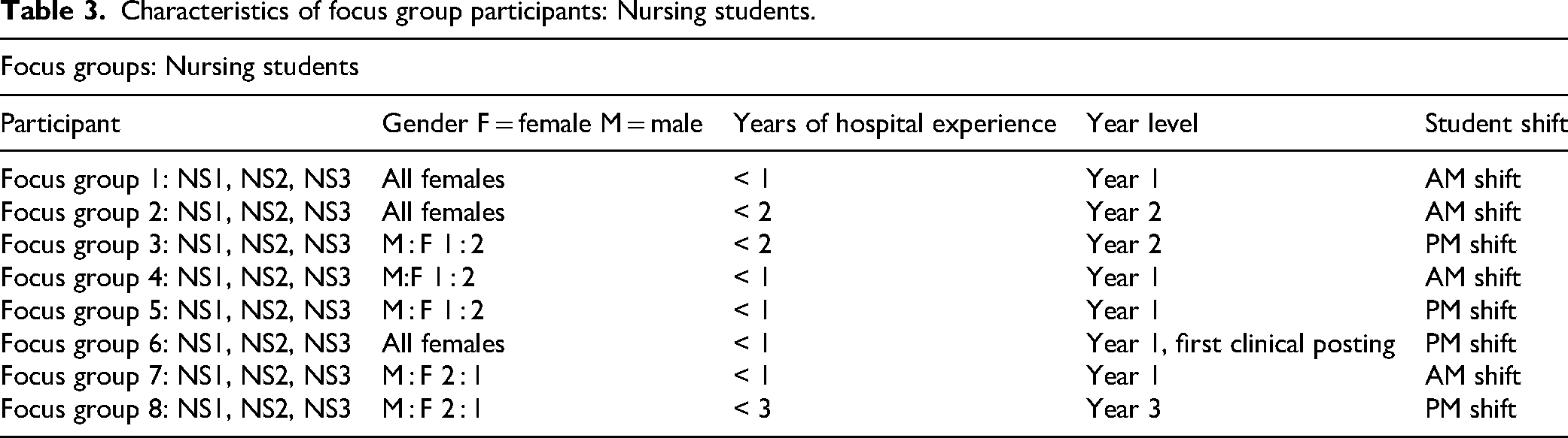 The characteristics of participants who completed the interviews are presented in Tables 1 to 5. The staff interviewed were mostly female, comprising individuals with a wide range of experience from newly graduated nurses to seasoned professionals with more than 20 years of experience. The nursing students were mainly from the first year of training, majority were female. The patient cohort was largely female than male, with falls being the most common diagnostic category. Eleven focus groups and 31 individual interviews were completed, and in total, 62 participants provided their insights.