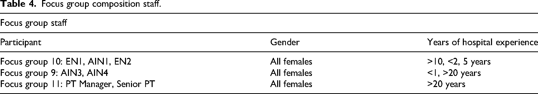 The staff and student interviews were completed by four clinician researchers from medical and physiotherapy backgrounds and one consumer representative, all of whom identified as female. Eight focus groups were conducted for the nursing students, with three students in each group. Two focus groups were conducted for nursing staff, with two members in one and three members in the other. A focus group was conducted for PTs with two members. The duration of the interviews and focus groups varied between 20 min and 1 h.