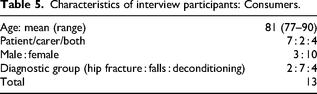 Two separate semistructured interview guides were developed for patients/carers and staff, informed by the Consolidated Framework for Implementation Research (CFIR; Damschroder et al., 2022). The interview guides are available in Supplemental Appendixes B and C. Patient/carer interviews were conducted by two local clinician researchers of medical and physiotherapy backgrounds with prior knowledge in qualitative research methods and identified as female. Both worked in the ward and were responsible for providing part of the clinical care to some of the participants interviewed. The interviews were conducted within a week of discharge from the hospital as a face-to-face or telephone interview. Patient participants could choose to have a carer participate as a proxy or to be interviewed together. The interviews ranged from 15 min to 30 min.