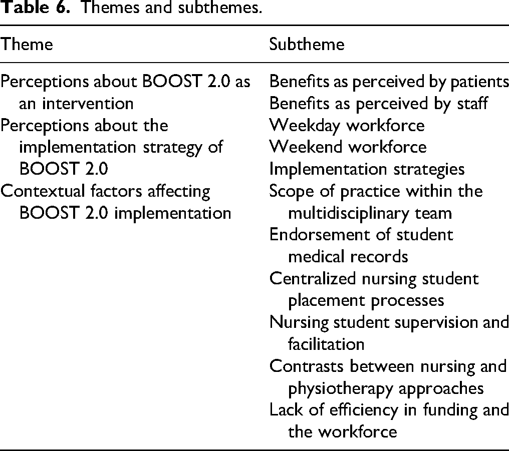 Three key themes were developed: (1) perceptions about the BOOST 2.0 intervention, (2) perceptions of the implementation strategy of BOOST 2.0, (3) BOOST 2.0 within the inner (ward) and outer (hospital) setting