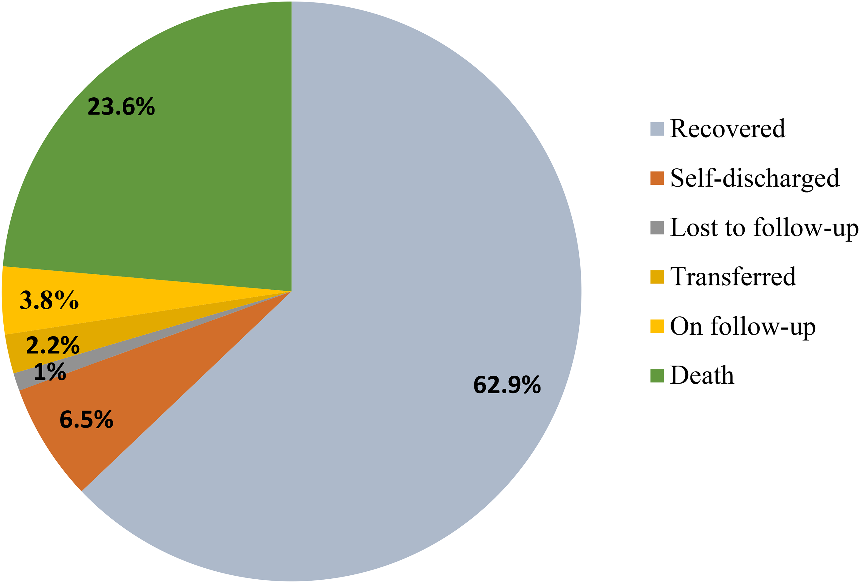 During the 28-day follow-up, 119 neonates (23.6%; 95% CI: 19.8, 27.4) died, resulting in a mortality rate of 35.5 deaths per 1,000 neonate-days based on 3,349 neonate-days of observation. Notably, 41% of deaths occurred within the first 24 h, and 90% within the first seven days. Among the 385 censored neonates, the majority recovered, with smaller proportions self-discharging, remaining under follow-up, transferring to other facilities, or lost to follow-up (Figure 1).
