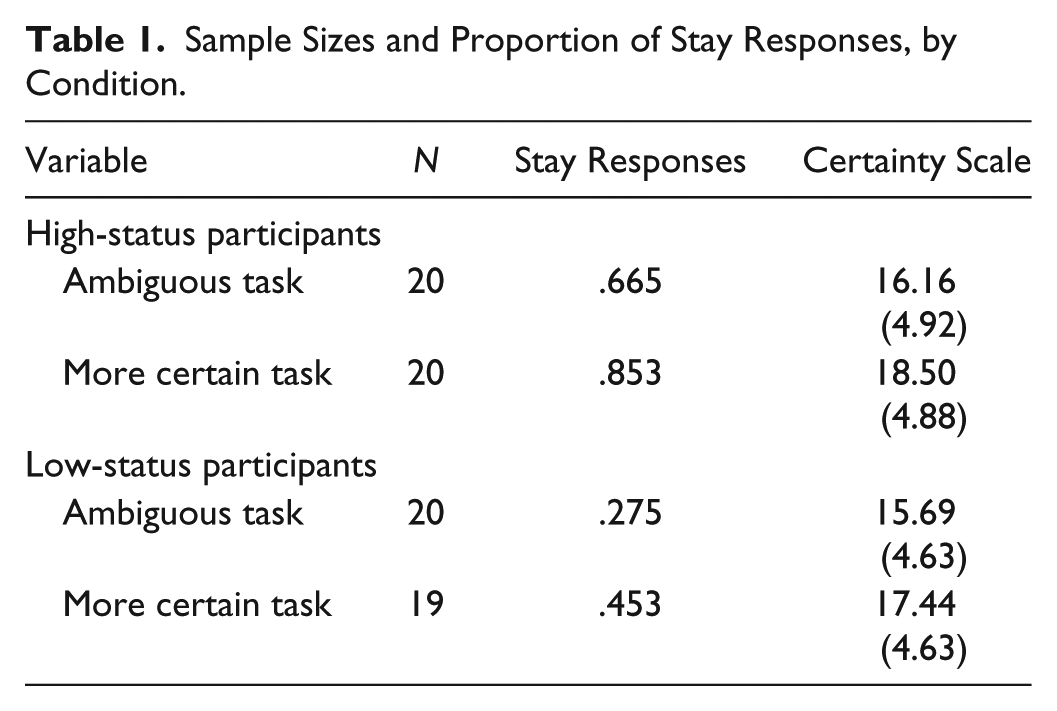 Table 1 presents the sample sizes and proportion of “stay” responses (i.e., rejecting influence) by condition. High-status participants (rows 1 and 2) stayed with their initial opinions more often than low-status participants (rows 3 and 4), which is consistent with much prior work and Hypothesis 1. Task certainty also seems to be associated with rejecting influence: those in the more certain conditions stayed with their initial opinions about 18 percent more often, whether high or low in status. On the one hand, this suggests that participants stay with their initial opinions more often on a more certain task. On the other, the effect of status is not reduced on the more certain task, as expected. Table 1 also presents perceptions of task certainty by condition. Higher-status participants and those in the more certain condition report higher levels of certainty, as expected.