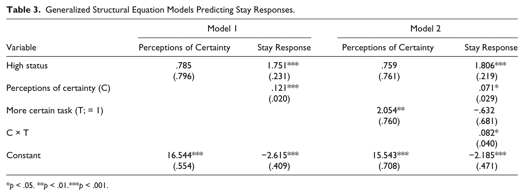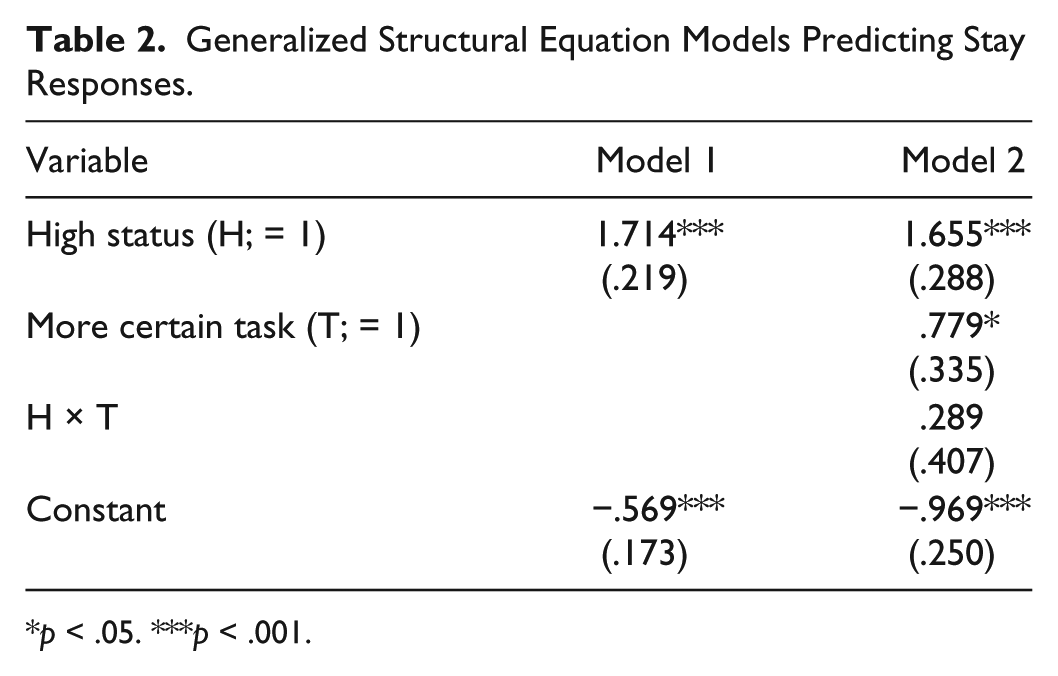 Finally, we predicted that the indirect effect of status on influence through the certainty scale would be weaker in the more certain condition (Hypothesis 4). To assess this hypothesis, we estimated another generalized structural equation model (with clustered standard errors) with one equation predicting stay responses as a function of the certainty scale, the status manipulation (= 1), the more certain condition (= 1), and the interaction between the status manipulation and the more certain condition. The second equation in the structural equation model predicted the certainty scale as a function of the status manipulation (= 1) and the more certain condition (= 1). Model 2 in Table 3 summarizes this model. The indirect effect of status through the certainty scale in the ambiguous (control) condition is .054 (i.e., .759 × .071), and the indirect effect of status through the certainty scale in the more certain condition is .116 (i.e., .759 × [.071 + .082]; see Hayes 2013:337–38). The difference in the two indirect effects is the inclusion of the significant interaction between perceptions of certainty and the more certain task. Specifically, bootstrapped CIs for the two indirect effects finds that the indirect effect in the ambiguous condition (.054) is different from zero (95% CI [.017, .102]) and that the indirect effect in the more certain condition (.116) is also different from zero (95% CI [.040, .198]). The presence of moderated mediation (i.e., the significant interaction between task certainty and perceptions of certainty) is consistent with Hypothesis 4, but the direction of the moderation is not as anticipated. We predicted that the indirect effect would be larger in the ambiguous condition (i.e., when there is more uncertainty to reduce) than in the more certain condition, but the results suggest that the indirect effect is larger in the more certain condition. We caution interpreting the difference in the indirect effects, however, since the 95% CIs on the indirect effects overlap. Clearly, more research is needed on this topic.