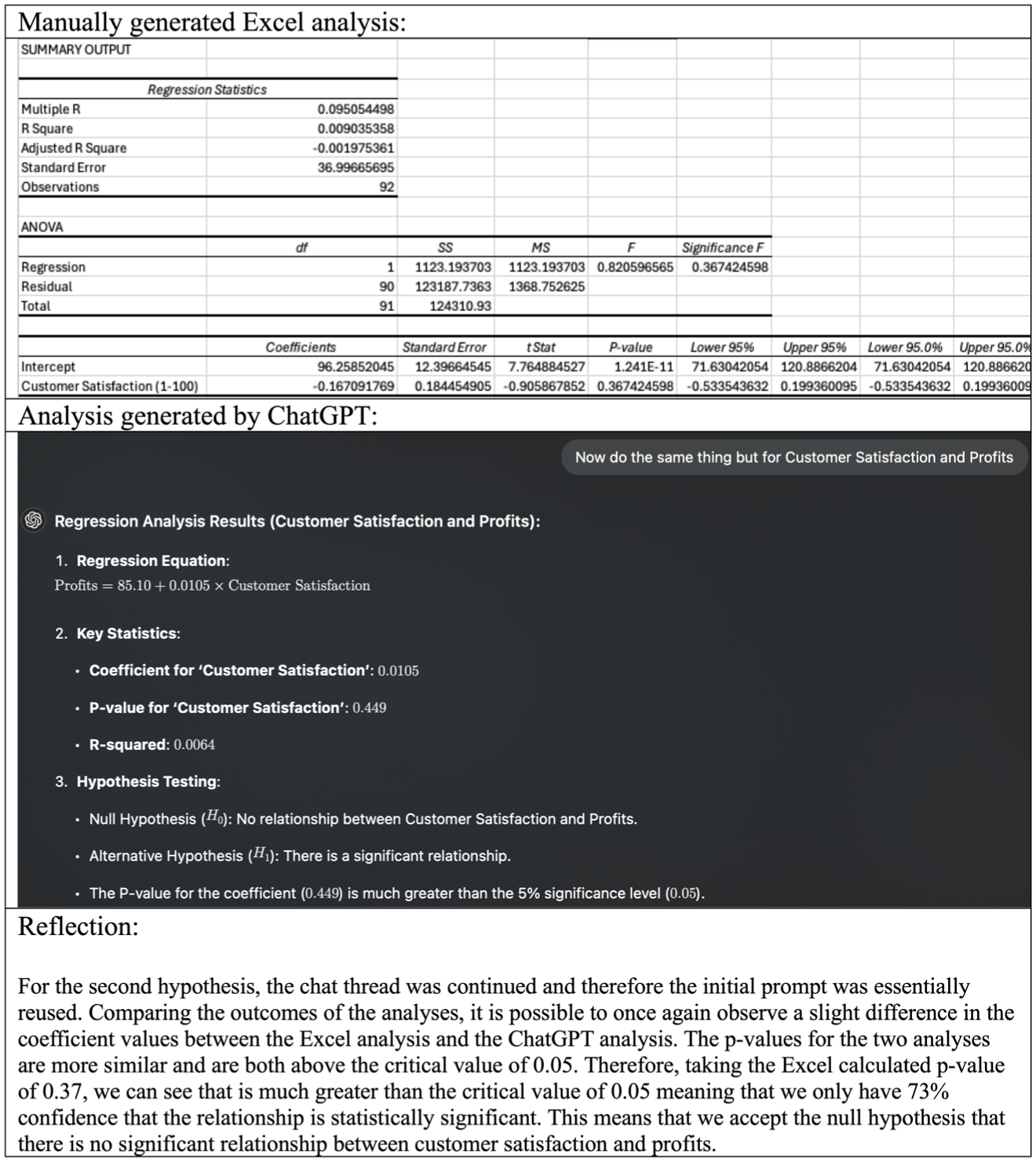 Students compile a structured report combining data analysis with reflection on GenAI’s role in this exercise. Figure 1 shows a sample comparing Excel and ChatGPT analyses, with student reflections on the comparison.