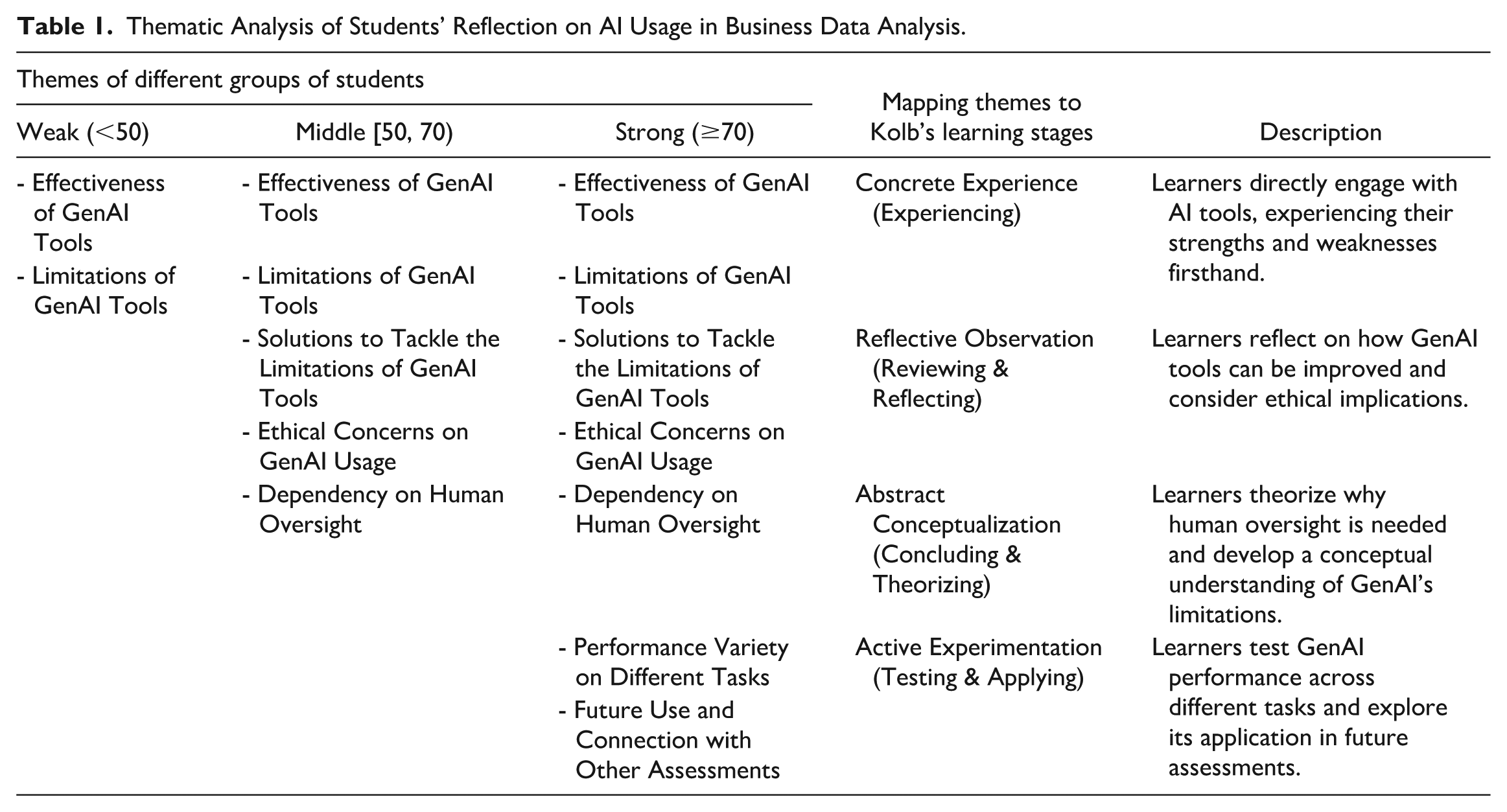 We did a thematic analysis of students’ reflections on AI tool usage, mapped to Kolb’s experiential learning cycle (see Table 1). Students were grouped into three performance bands: weak (score below 50), middle (score between 50 and 69), and strong (score of 70 or above). The module includes assessments and coursework tasks that go beyond the use of GenAI, so the final grade provides a comprehensive reflection of students’ overall performance beyond this exercise. By mapping students’ reflections to Kolb’s framework, we identified distinct patterns in how students engaged with GenAI tools, from direct experience to conceptual understanding and application.