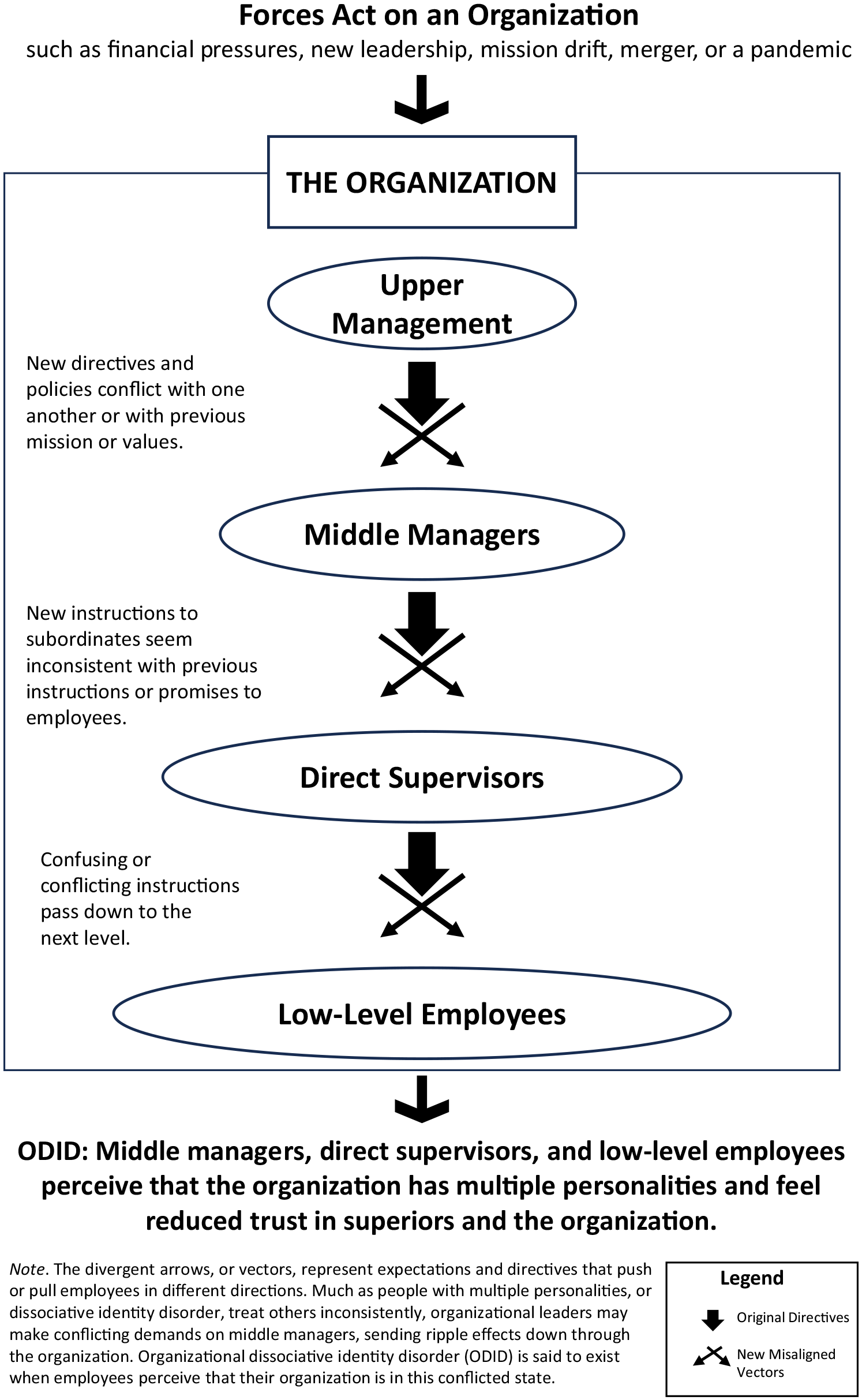 Because the official psychiatric diagnosis for a person with multiple personalities is dissociative identity disorder, 6 we added “organizational” to “dissociative identity disorder” to create a term that describes the situation in which employees perceive that their organization has developed values, expectations, and policies that are inconsistent with one another or with the organization’s mission statement. (Note that ODID exists when employees sense these contradictions in their organization; conversely, if the organization is objectively behaving in contradictory ways but employees do not perceive the contradictions, then ODID does not exist.)