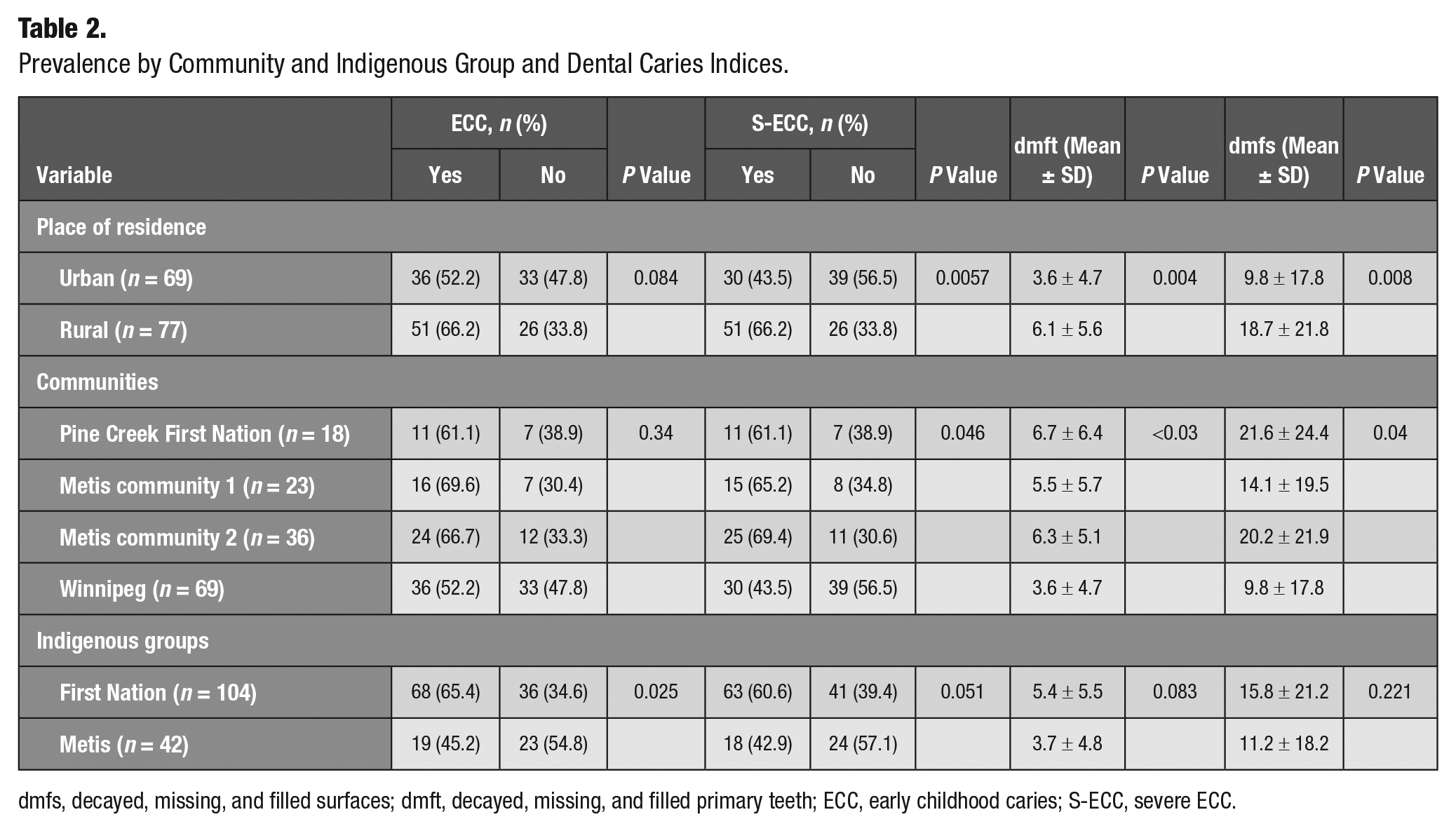 Dental caries indices scores were also compared by place of residence, community, and Indigenous groups (Table 2). When dental caries indices were compared between urban- and rural-dwelling children, both the mean dmft and dmfs scores were found to be significantly higher for those from rural communities compared with children living in an urban community (