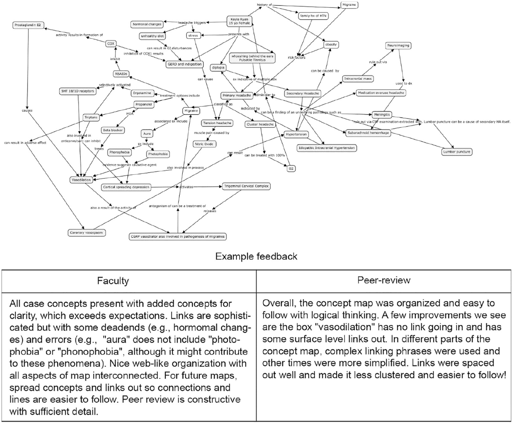 Example of student-group concept map and associated feedback from faculty and peer review. Clinical case topic was “migraine headache” to integrate foundational science and clinical practice concepts.