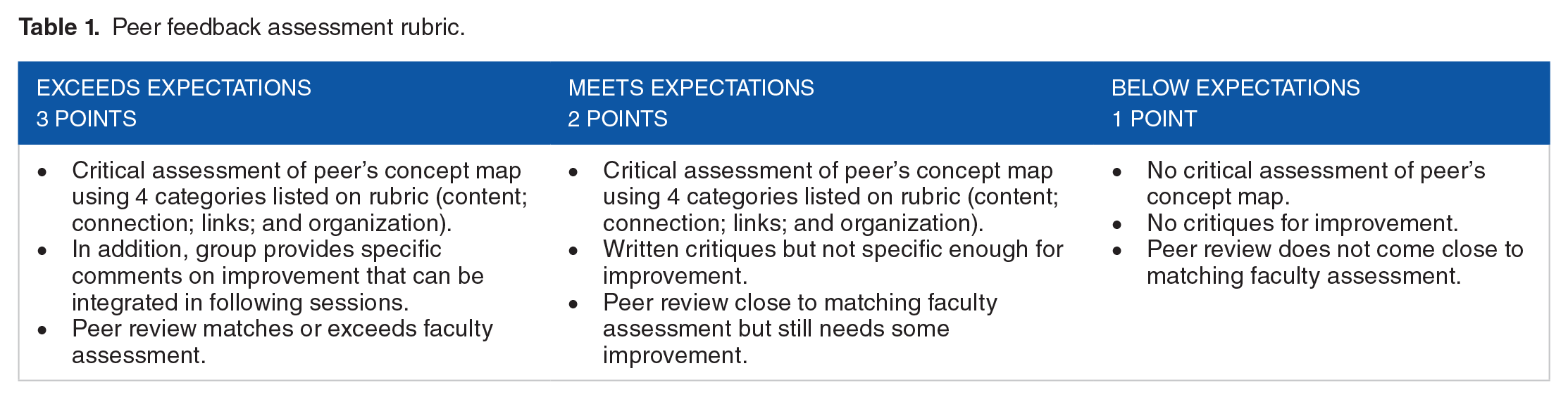 Student groups received weekly peer feedback on case-based concept maps created during the learning session. Similarly, following completion of the session and before the subsequent session, faculty facilitators provided written feedback on student-group-generated concept maps including a point total using the concept map assessment rubric. 24 Along with the concept map assessment rubric scores, student groups were assessed on the quality of peer-review feedback using the peer-review feedback assessment rubric (Table 1).