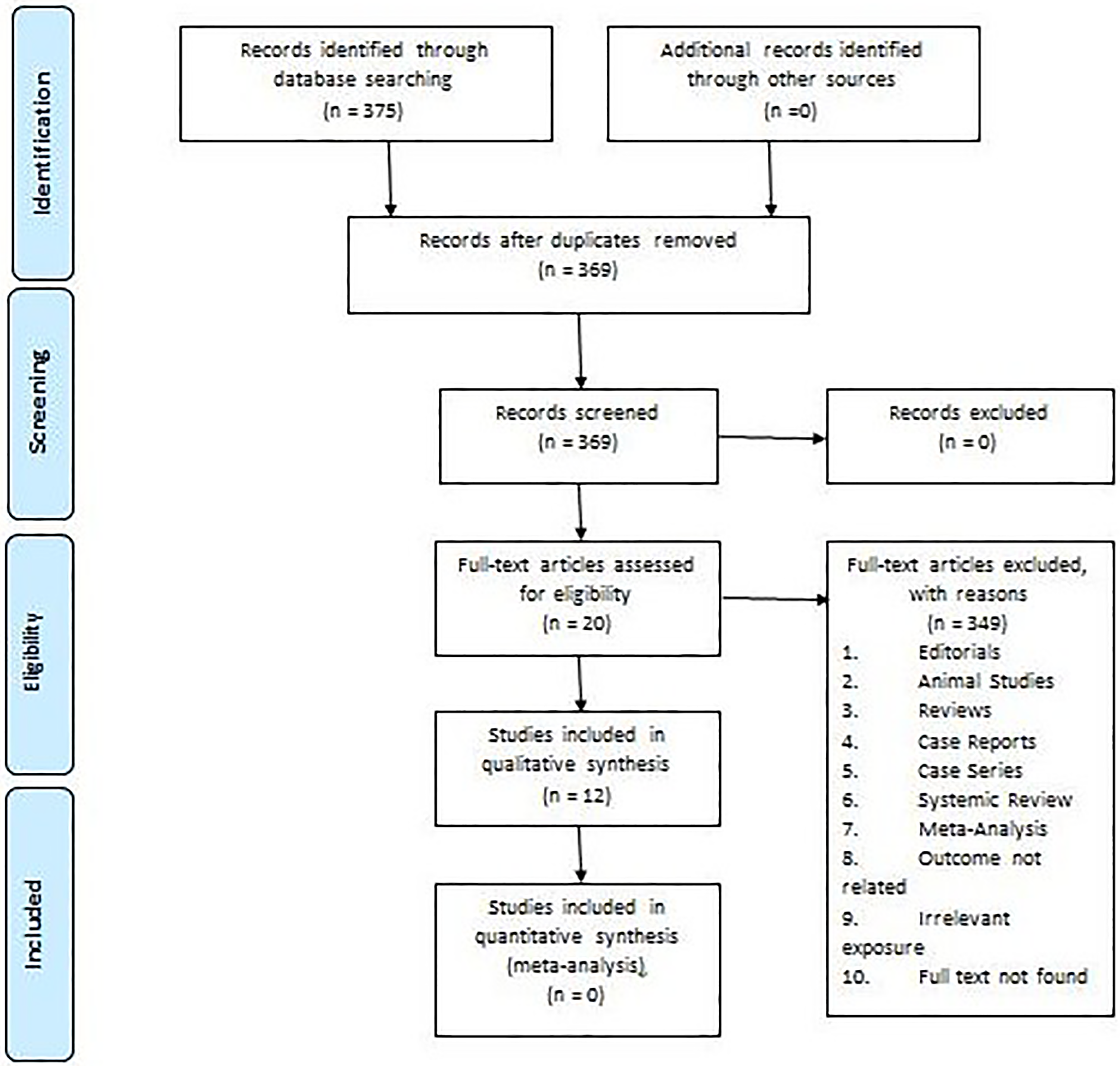 A total of 375 articles were selected after the initial search. After removing duplicates and performing title/abstract screening, we included a total of 20 articles for full-text review. Finally, a total of 12 articles were included in this review1,2,4,10,11,13,15–20 (Figure 1).