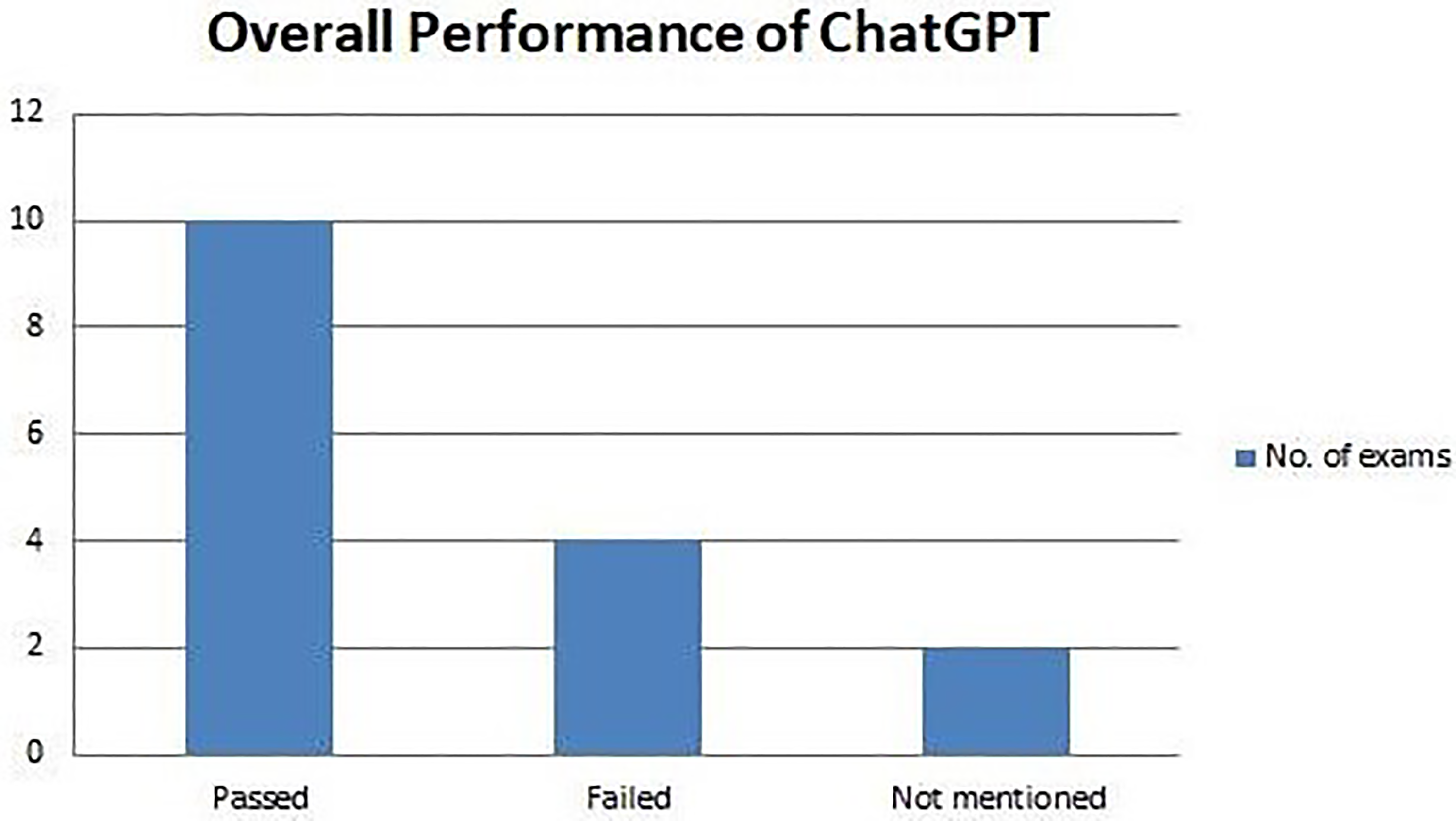 We will classify the performance of ChatGPT based on the conclusion stated by the individual study included in the review. We will consider its performance to be bad if a study reports that ChatGPT failed to reach the passing threshold, an average of a study states that ChatGPT's performance was near equal or equal to the passing threshold, and good when a study states that ChatGPT's performance was not only greater than passing threshold but it passed with distinction or considerably better than an average human score in the same exam.