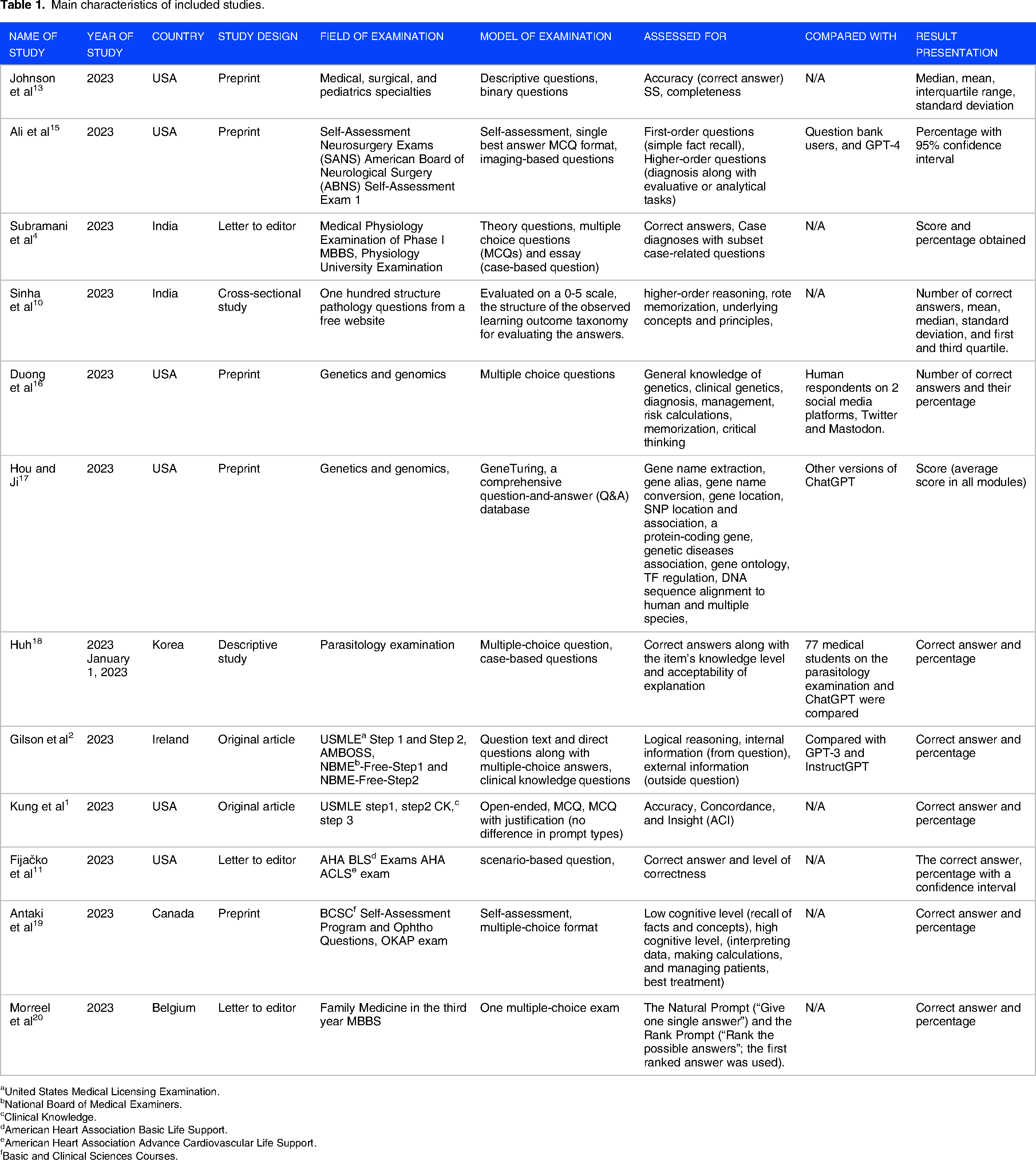 A total of 12 studies evaluating ChatGPT performance in different exams were selected.1,2,4,10,11,13,15–20 All the selected papers assessed the academic performance of ChatGPT-3.5. One study compared the performance of ChatGPT-3.5 with the performance of ChatGPT-4 when giving a medical exam. Out of these 12 studies, 5 studies were preprint,13,15–17,19 3 were letters to editors,4,11,20 2 were original studies,1,2, 1 was a cross-sectional study, 10 and 1 study was descriptive. 18 These studies were conducted across different countries. Out of these 12 studies, 7 were conducted in the United States of America,1,2,11,13,15–17 2 were conducted in India,4,10 while only 1 study was conducted in Belgium, 20 Ireland, 2 Canada, 19 and Korea. 18 The main characteristics of the included studies have been displayed in Table 1.