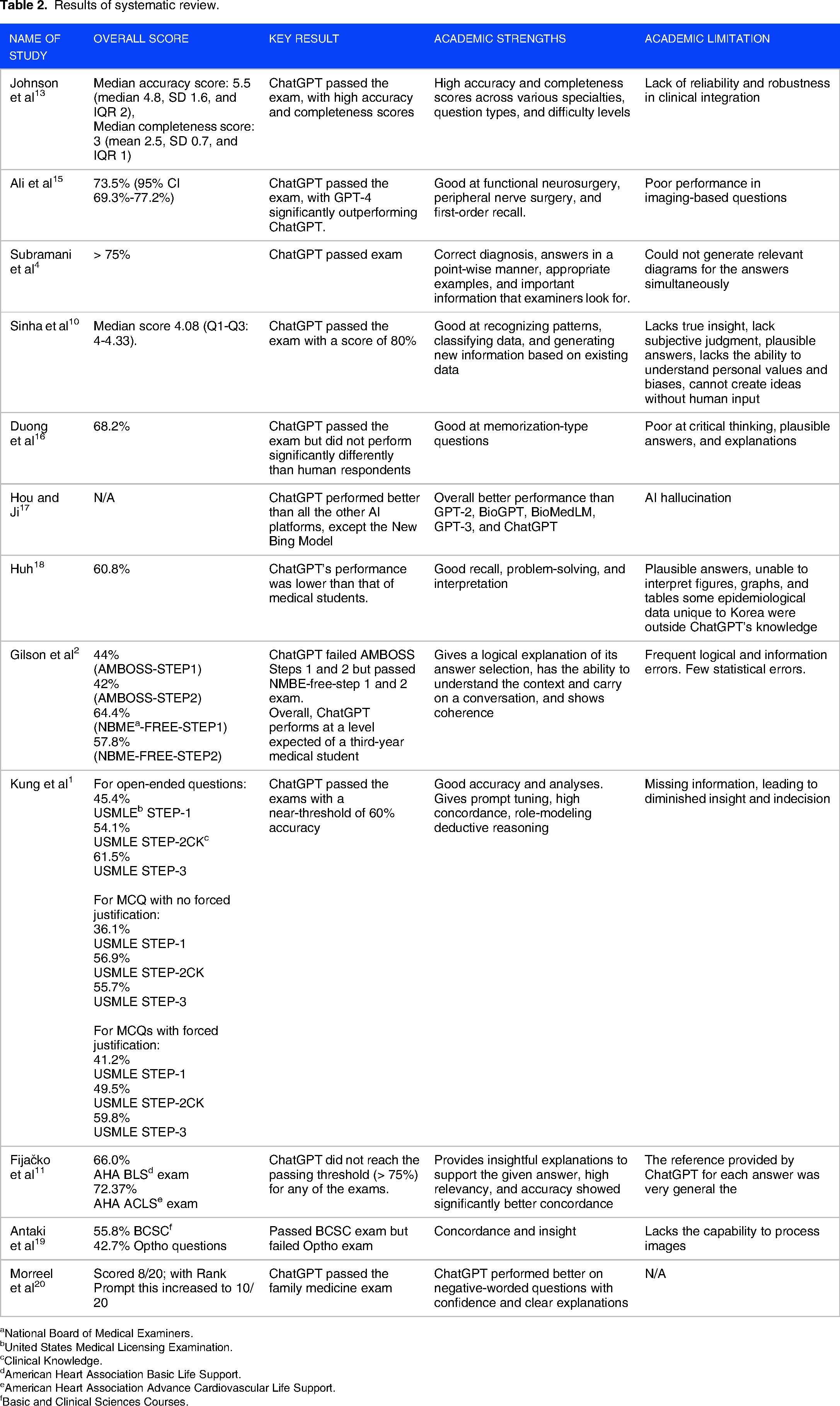 After rigorous screening, 12 articles underwent this review. All the selected papers assessed the academic performance of ChatGPT-3.5. One study compared the performance of ChatGPT-3.5 with the performance of ChatGPT-4 when giving a medical exam. Overall, ChatGPT performed well in 4 tests, averaged in 4 tests, and performed badly in 4 tests. ChatGPT's performance was directly proportional to the level of the questions’ difficulty but was unremarkable on whether the questions were binary, descriptive, or MCQ-based. ChatGPT's explanation, reasoning, memory, and accuracy were remarkably good, whereas it failed to understand image-based questions, and lacked insight and critical thinking.