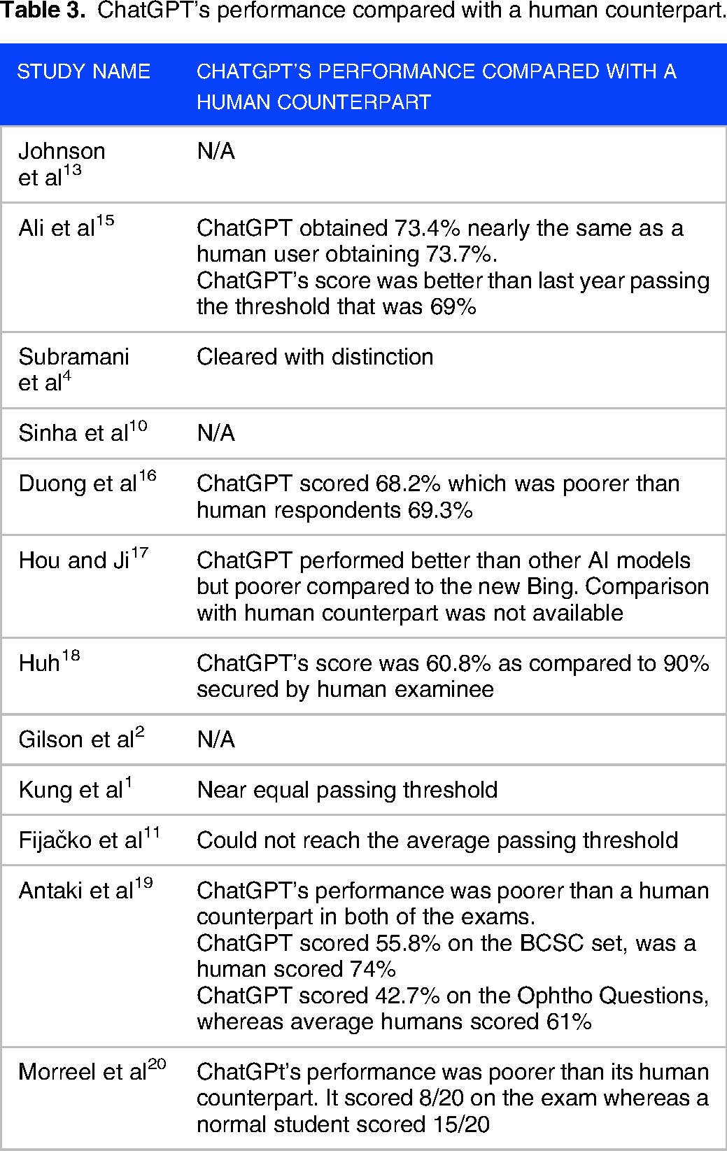 Twelve studies have evaluated the potential of ChatGPT-3.5 in various academic tests.1,2,4,10,11,13,15–20 Out of these tests, ChatGPT-3.5 performed very well in 4 tests,4,10,13,17 average in 4 tests,1,2,15,16 and performed badly in 4 tests.11,18–20 In the study by Sinha et al, 10 ChatGPT performed reasonably achieving a median score of 4 out of 5. Johnson et al 13 evaluated ChatGPT's performance across 17 different specialties and found that ChatGPT performed well both in accuracy and completeness. When ChatGPT was asked to take a first-year physiology exam, ChatGPT cleared it with distinction. 4 However, there were a few studies in which ChatGPT did not perform well. In a parasitology exam, ChatGPT scored 60.8% as compared to the 90.8% score by first-year medical students. 18 Similarly, ChatGPT failed the American Heart Association BLS and ACS examinations. 11 In other studies, ChatGPT significantly underperformed as compared to their human counterpart.15,20 Along with these studies, there were a few studies in which ChatGPT performed satisfactorily.1,2,15,16 Two studies evaluated ChatGPT's performance in USMLE examinations.1,2 ChatGPT barely reached the passing threshold in both studies. Similarly, ChatGPT scored 68.2% as compared to 69.3% by the human respondents in a genetic examination. 16 In another study, ChatGPT scored nearly the same as examinees giving neurosurgical board examinations. 15 Some studies compared ChatGPT's performance with other AI models.15,17 ChatGPT outperformed its previous models like GPT-1, GPT-2, and GPT-3. However, it could not score as well as GPT-4 or New Bing models. The academic performance of ChatGPT is displayed in Figure 2. The academic potential and limitations of ChatGPT have been comprehensively stated in Figures 3 and 4, respectively. The results of the systematic review have been mentioned in Table 2. Also, a comparison of ChatGPT's performance with a human counterpart is mentioned in detail in Table 3.
