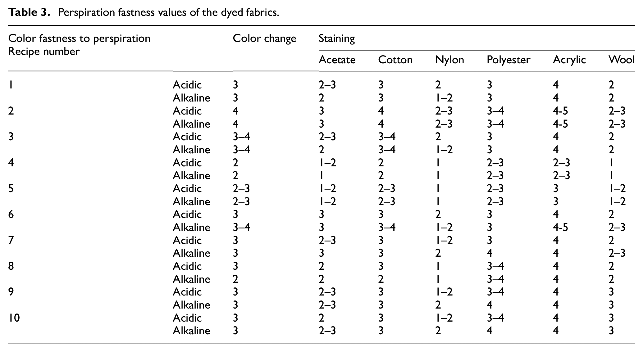 Perspiration fastness values of the dyed fabrics.