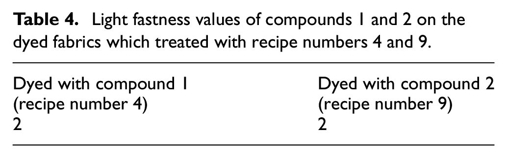Light fastness values of compounds 1 and 2 on the dyed fabrics which treated with recipe numbers 4 and 9.