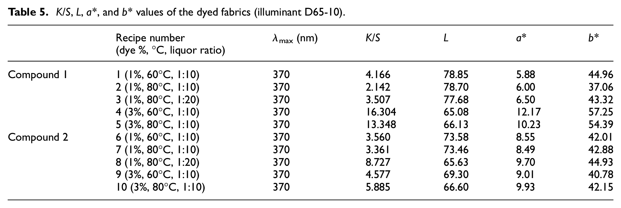 The results of the spectrophotometric measurements of the dyed fabrics are shown in Table 5. The dyed cotton samples exhibited uniformly different shades of orange color. The absorption maximum of compounds 1 and 2 on dyed fabrics (λmax) was found to be 370 nm. The fabrics dyed with compound 1 had a yellower color shade than the fabrics dyed with compound 2. Color shades changed with the change in the extent of delocalization of electrons depending on the dye structure. The presence of nitrogen atom in compound 2, the only difference between the compound 1 and 2 structures, may cause more delocalization and bathochromic shift. Bathochromic shifts make the light absorbed redder.