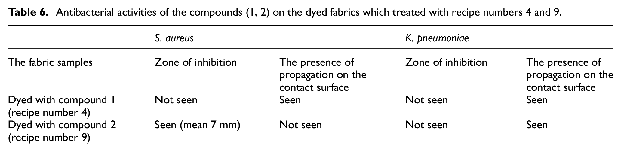 Antibacterial properties of the fabric samples treated with recipe numbers 4 and 9 (for 3% dye concentration with 1:10 liquor ratio at 60°C) are given in Table 6. Whereas the fabric dyed with compound 2 demonstrated acceptable antibacterial activity against