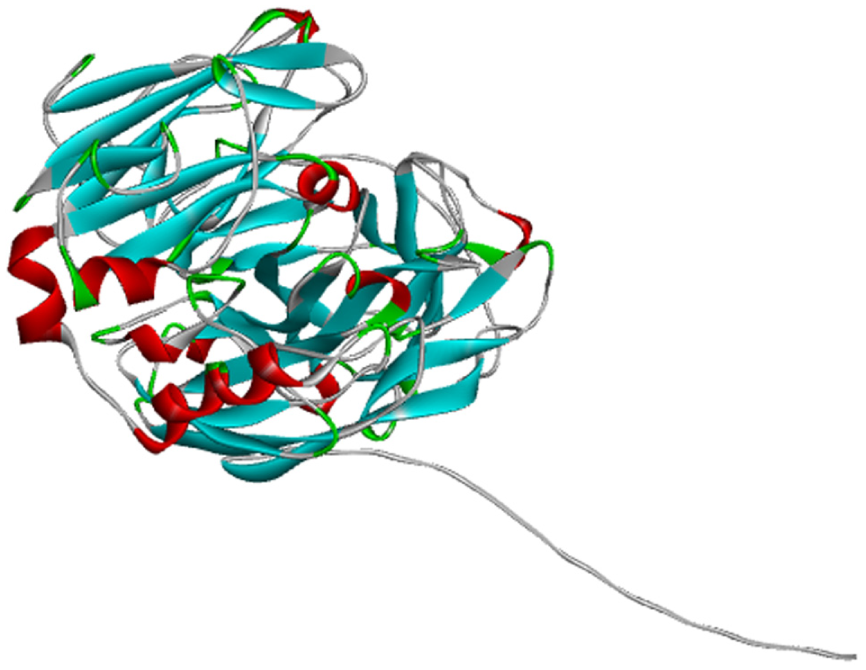 Homology modeling of laccase, peroxidase MSP1, and tyrosinase was performed through SWISS-Model-Expasy, and the model with a high percent identity with the template of each enzyme was downloaded for further analysis. Figures 1–3 show the three-dimensional structure of each enzyme.