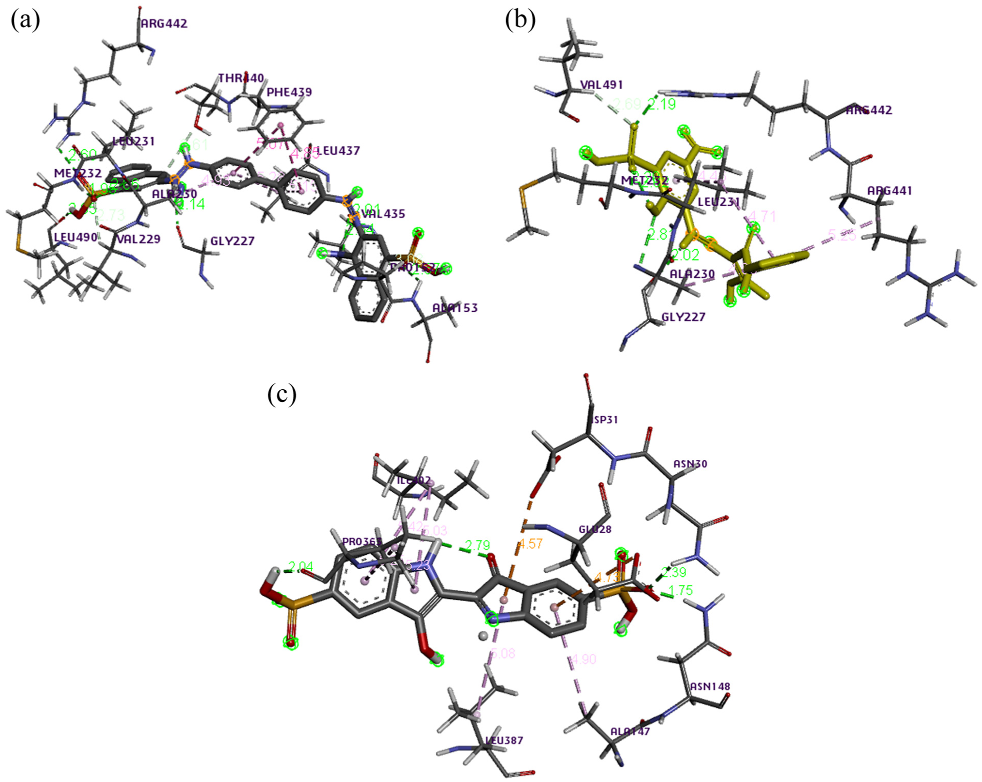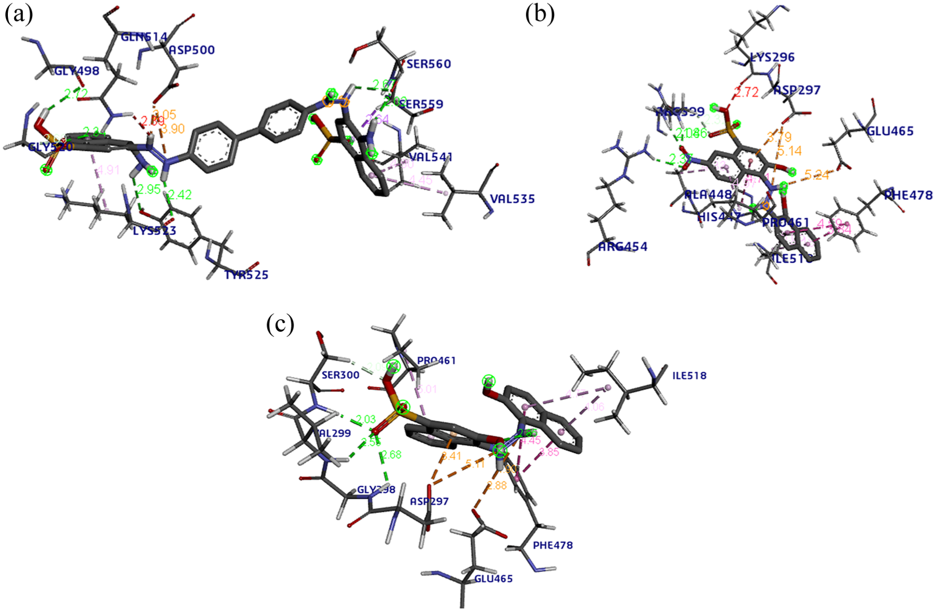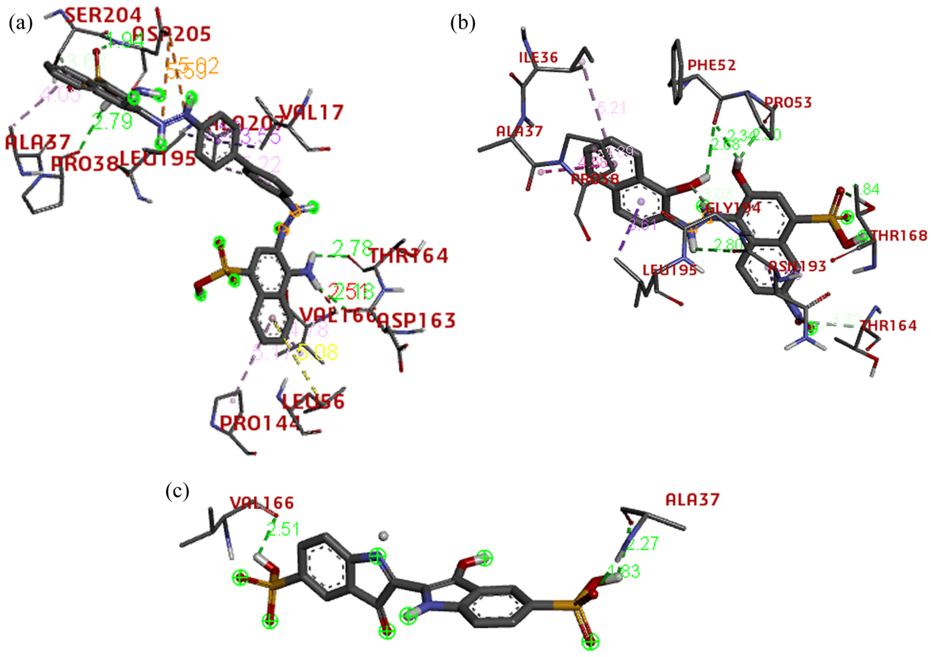 Molecular interaction analysis of tyrosinase with (a) Congo red, (b) acid yellow 99, and (c) Indigocarmine.