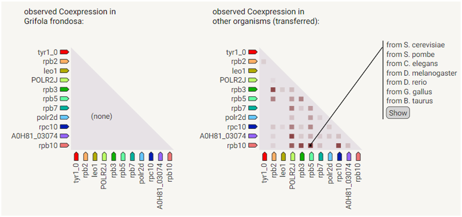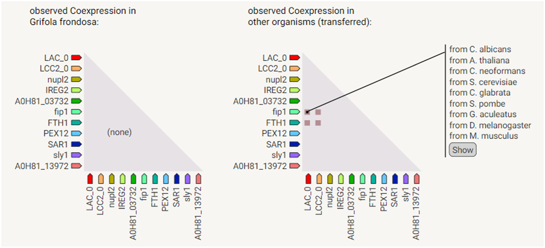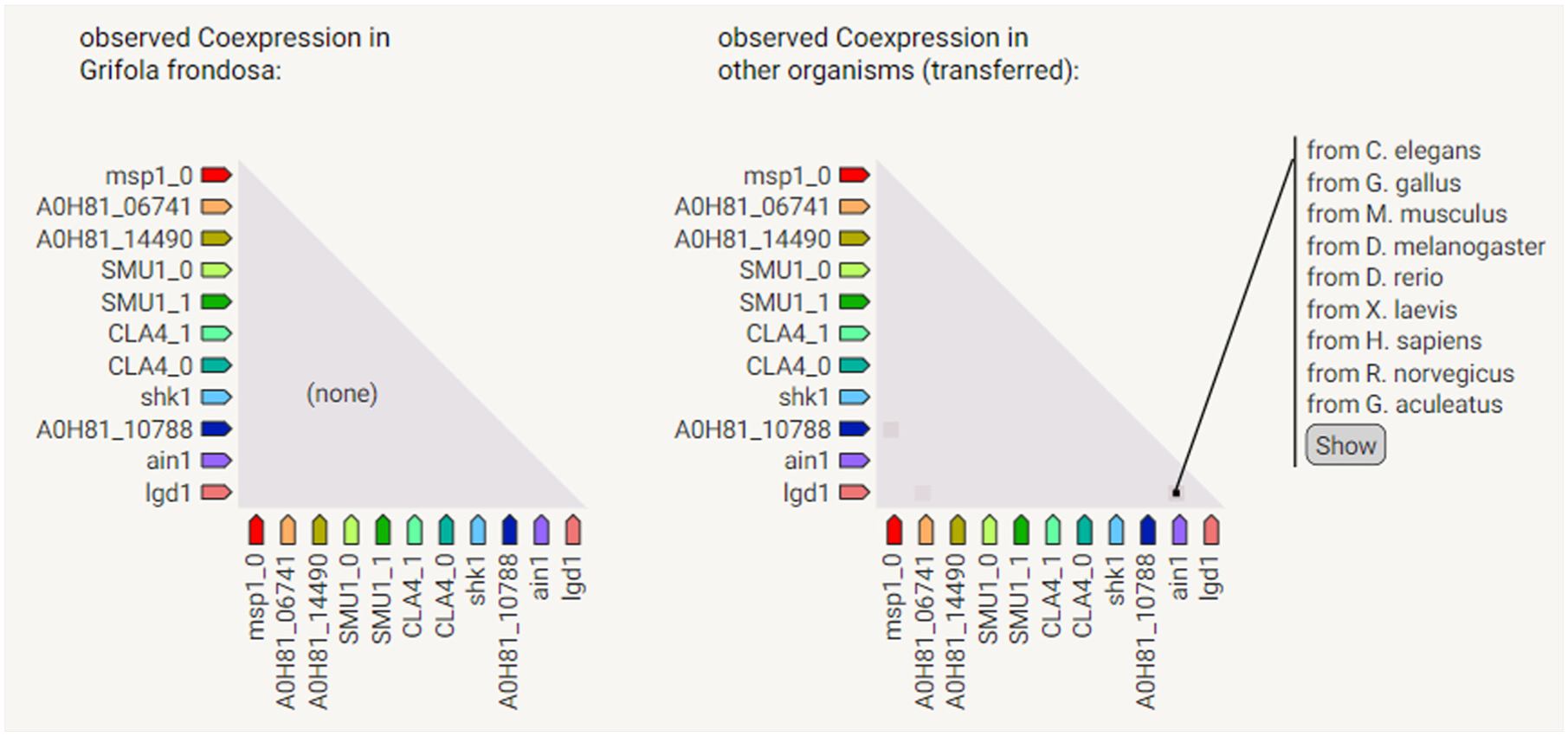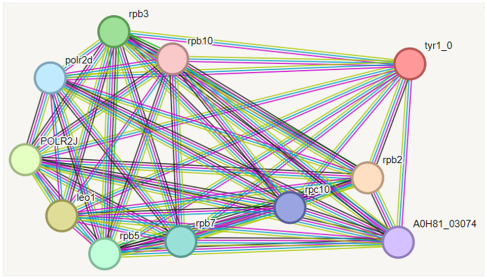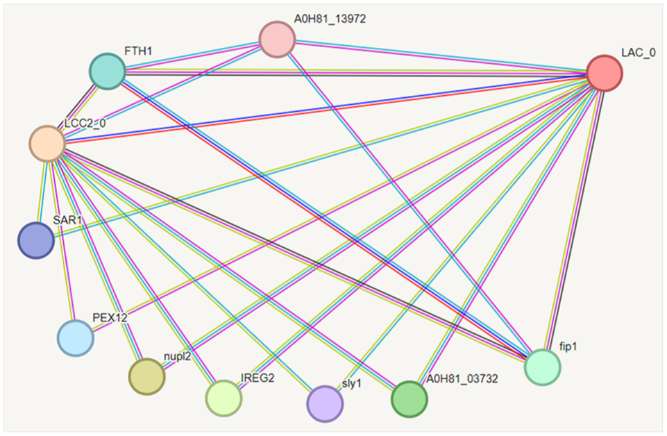 Co-expression analysis of genes encoding laccase, tyrosinase, and dye-degrading peroxidase MSP1 was also performed using the STRING database. The co-expression data for the selected enzymes were analyzed to identify gene clusters potentially involved in azo dye degradation. 23