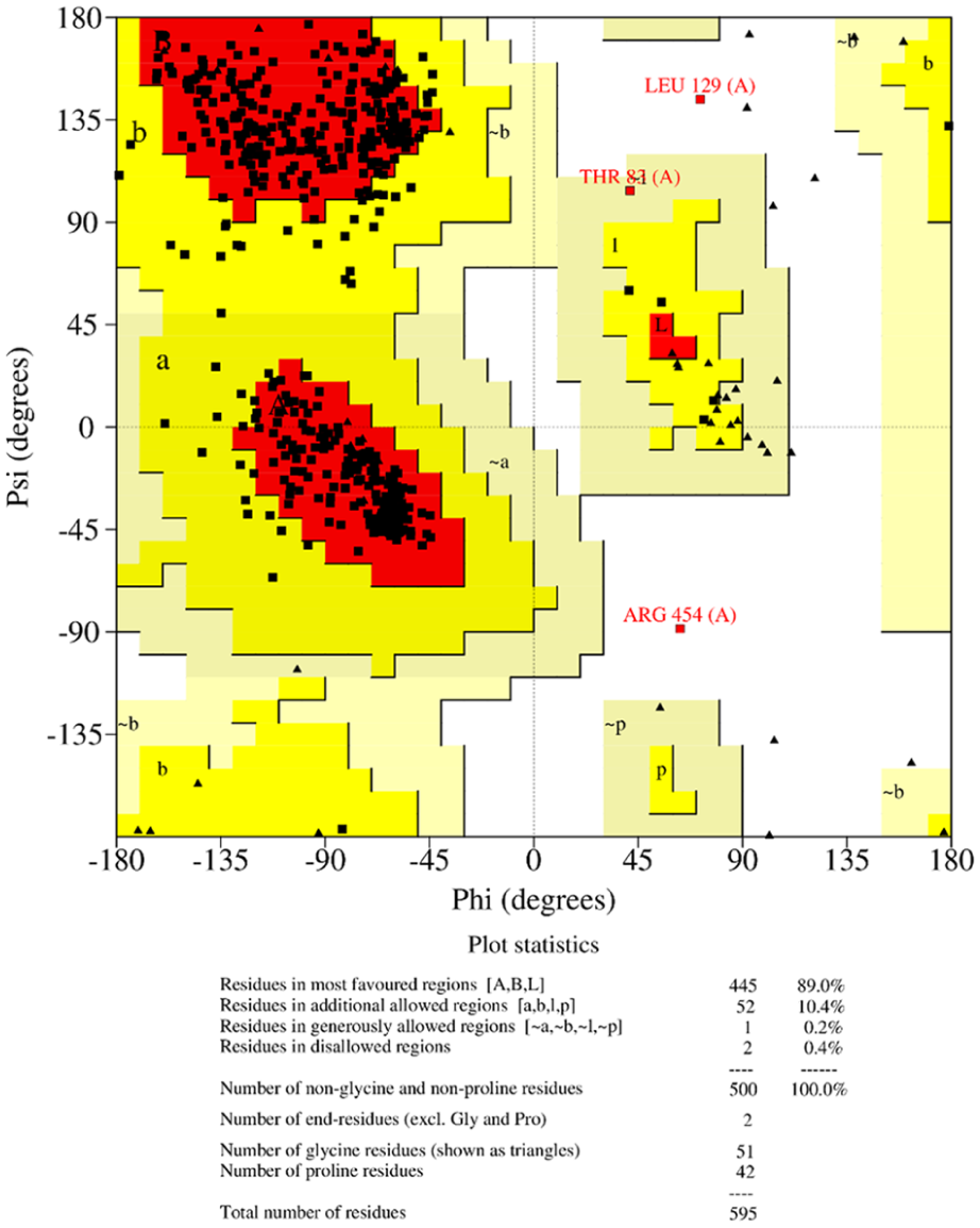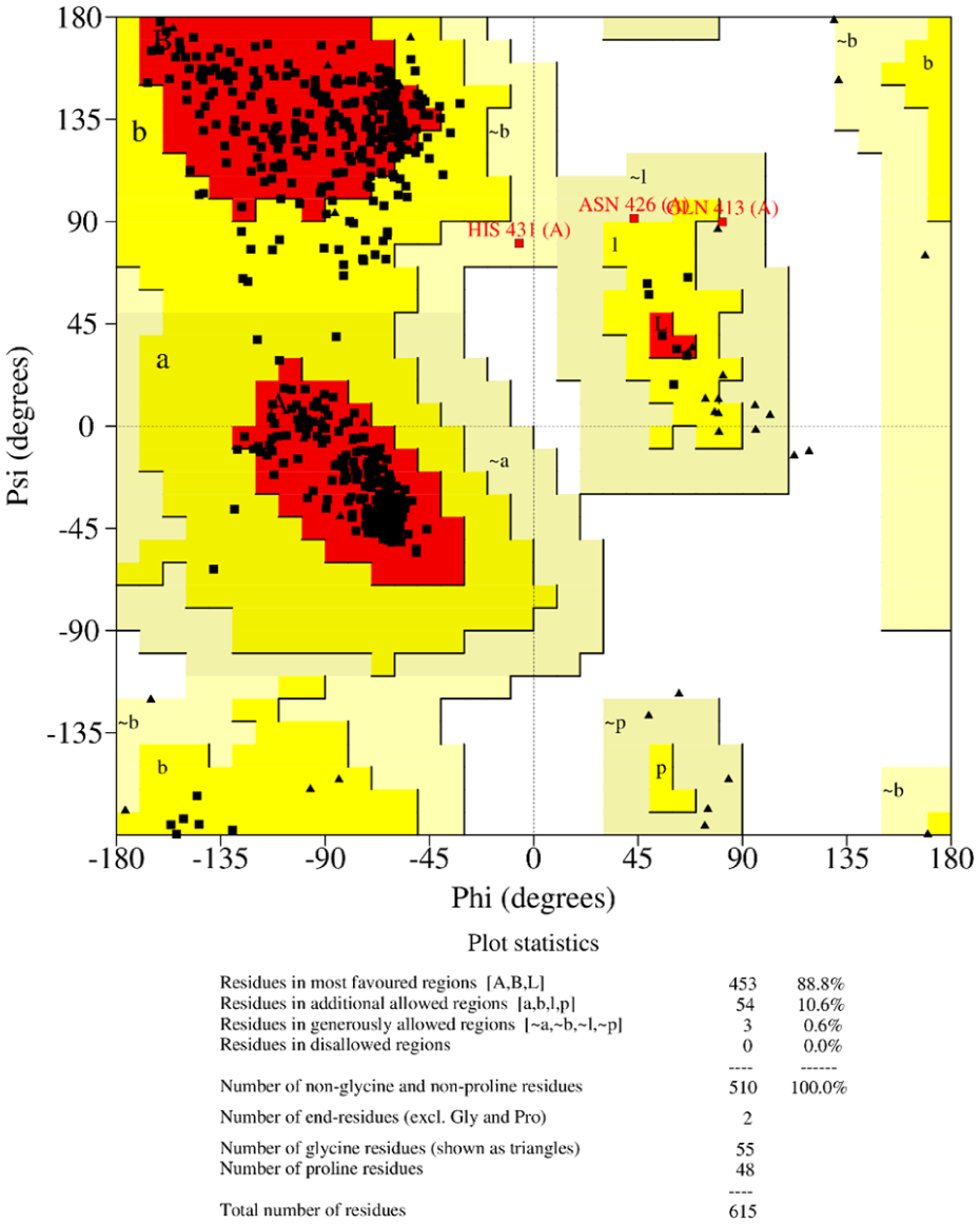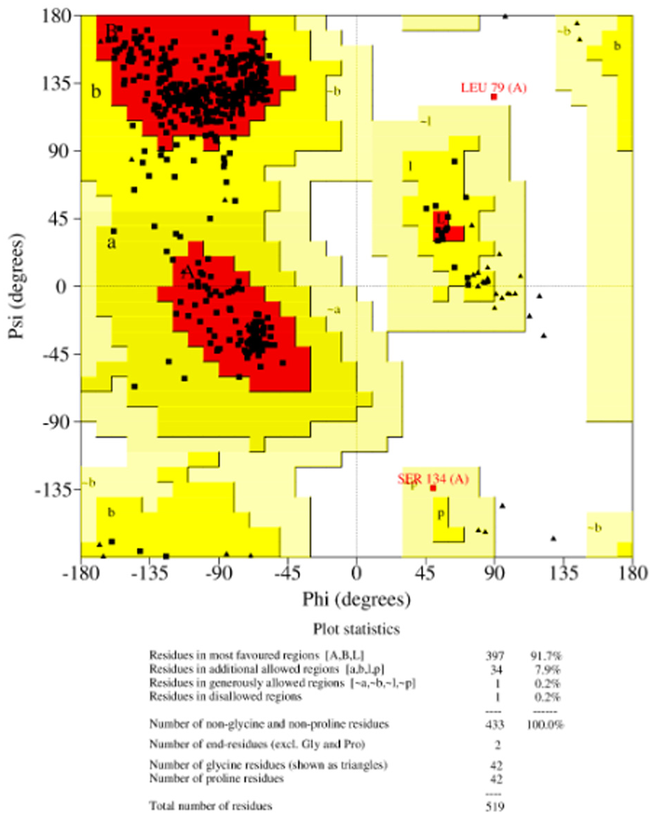 Model quality was evaluated using PROCHECK and ERRAT via the SAVES server. Ramachandran plots were used to assess residue distribution, and ERRAT was used to identify potential error-prone regions. 17