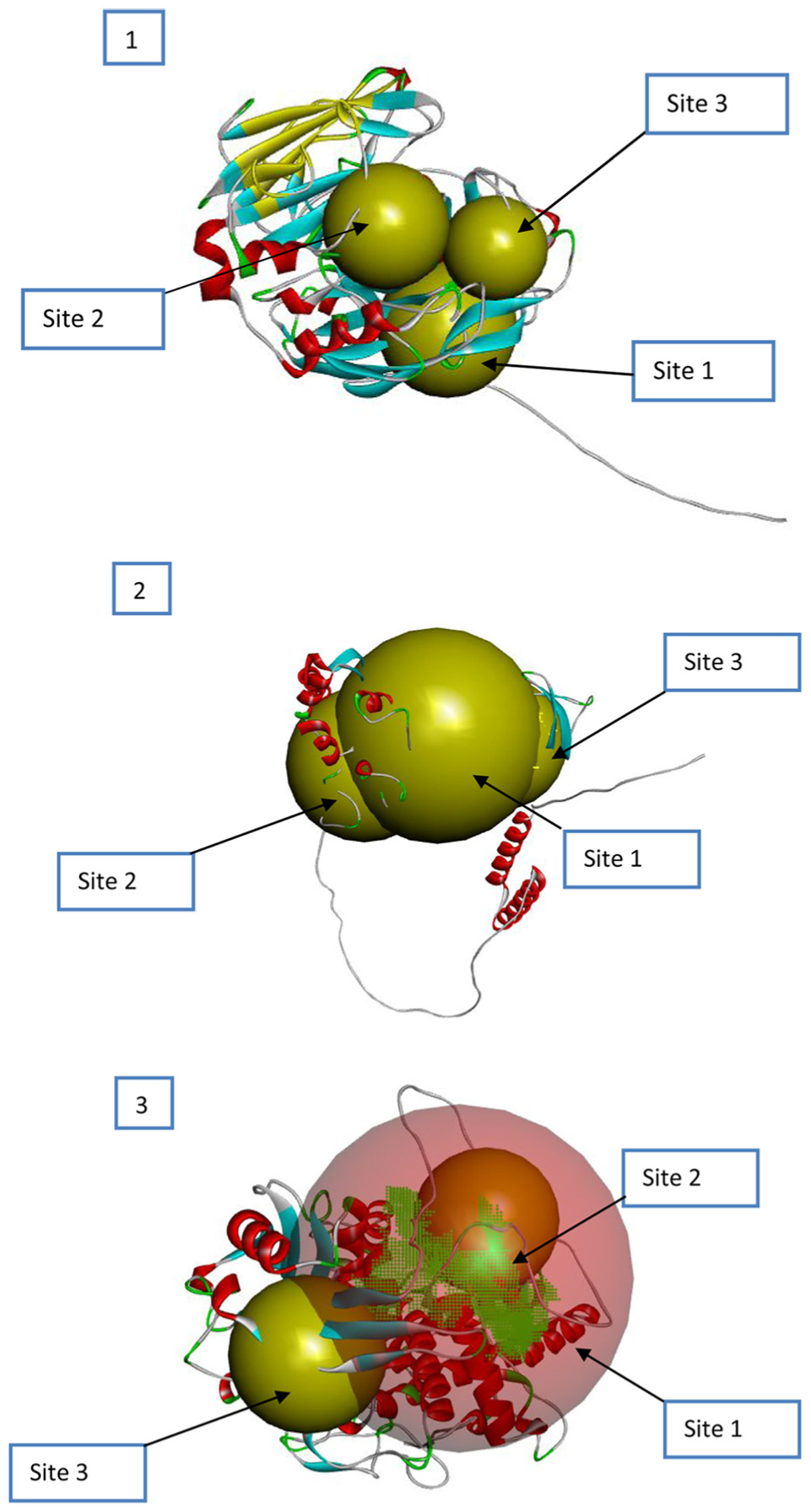 Active sites predicted by Discovery Studio for (1) laccase, (2) peroxidase MSP1, and (3) tyrosinase.