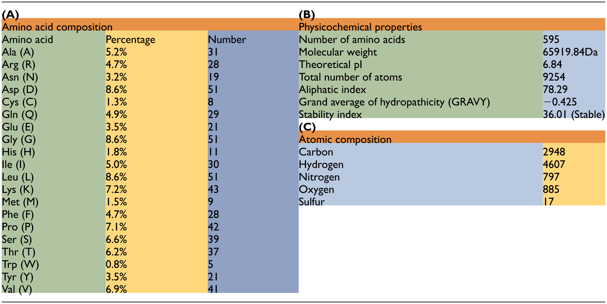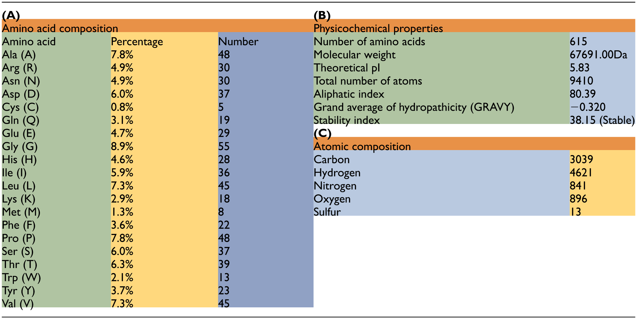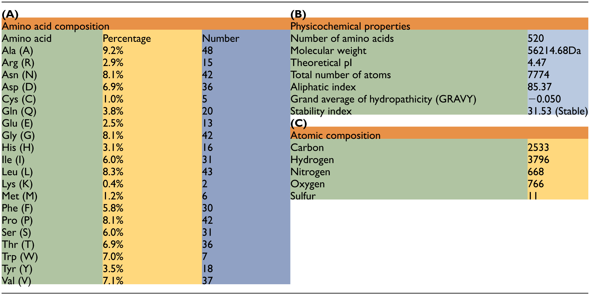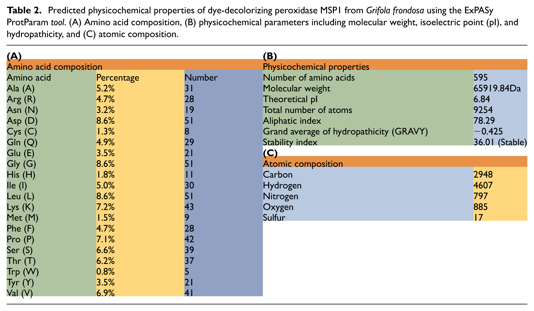 The physicochemical properties of the enzymes were analyzed using the ExPASy ProtParam, which calculates parameters such as molecular weight, theoretical pI, amino acid composition, half-life, instability index, aliphatic index, and GRAVY. 15