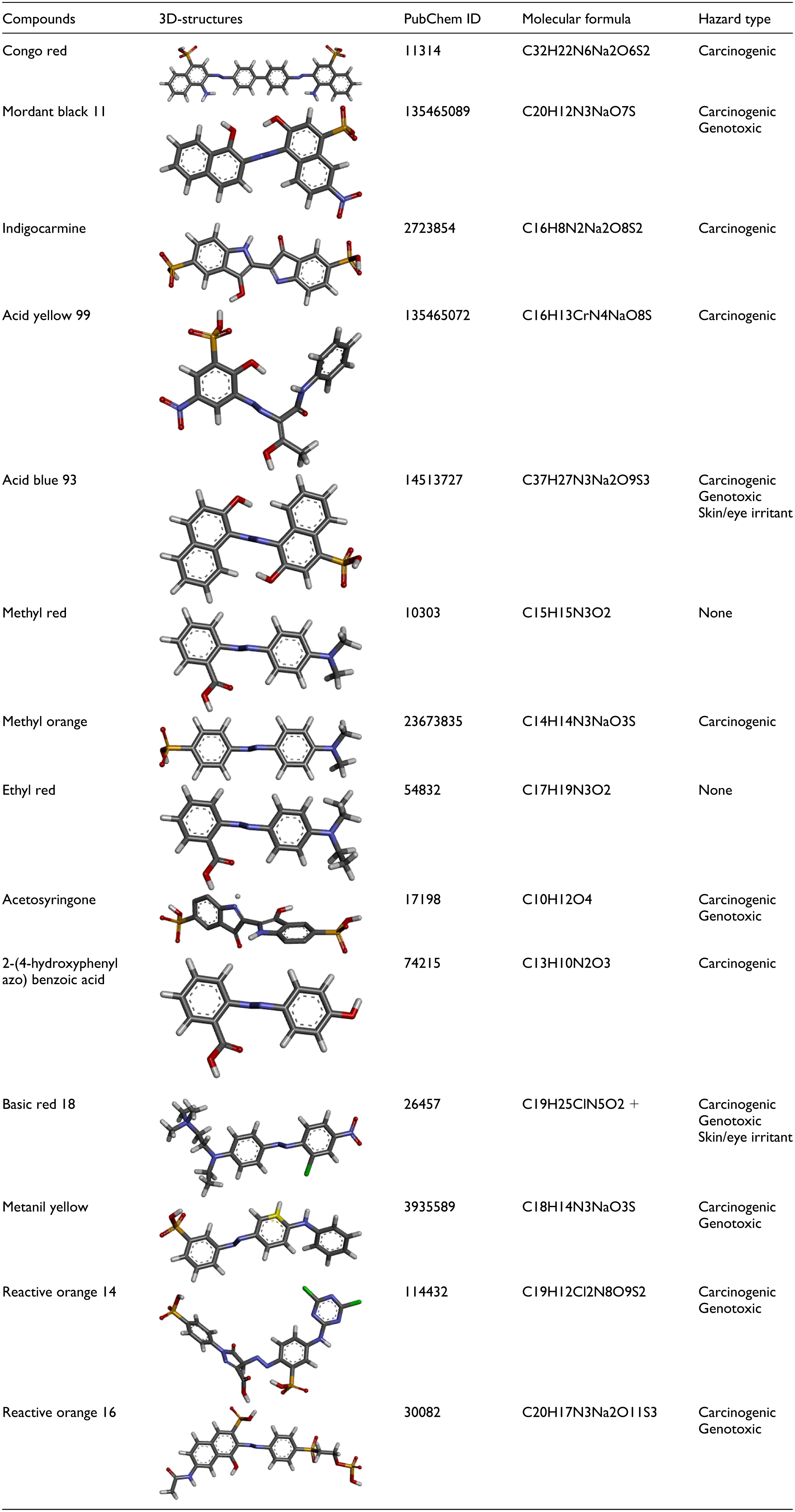 The PubChem database was used to obtain 14 3D structures of azo dyes as SDF files. Table 4 provides the names, structures, and molecular formulas, along with the PubChem ID of target pollutants and the hazard type of the specific pollutant.