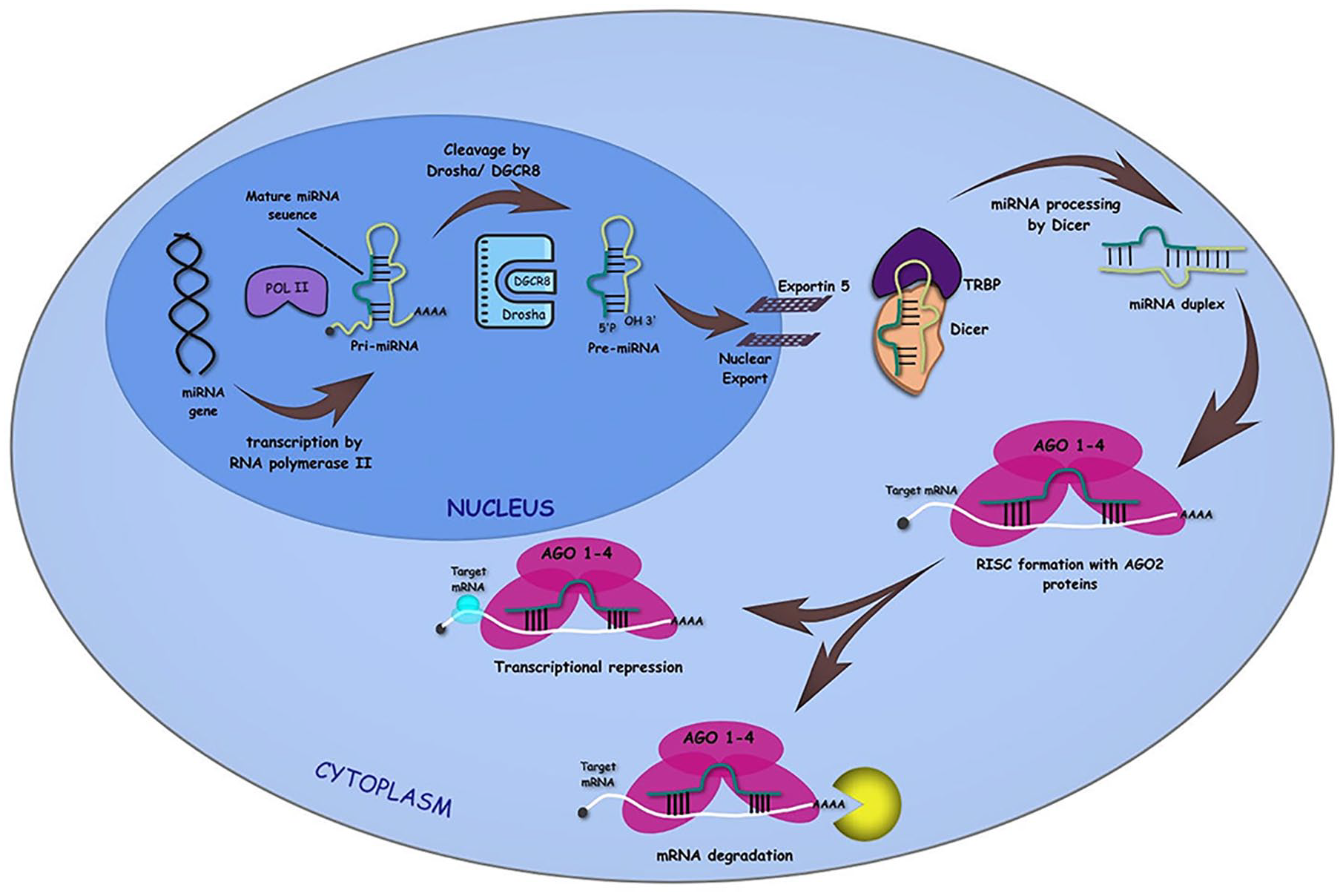 The Biogenesis of microRNAs by Canonical Pathway: Maturation of miRNA sequence by transcription of primary miRNAs or Pri-miRNAs from the miRNA gene by RNA polymerase II followed by the cleavage of Pri-miRNAs to precursor or Pre-miRNAs through Drosha/DGCR8. The Pre-miRNAs are then exported from nucleus to cytoplasm with the help of Exportin 5. In the cytoplasm, Dicer cleavage of the hairpin structure takes place, where one of the strands of the miRNA duplex is loaded onto the RISC