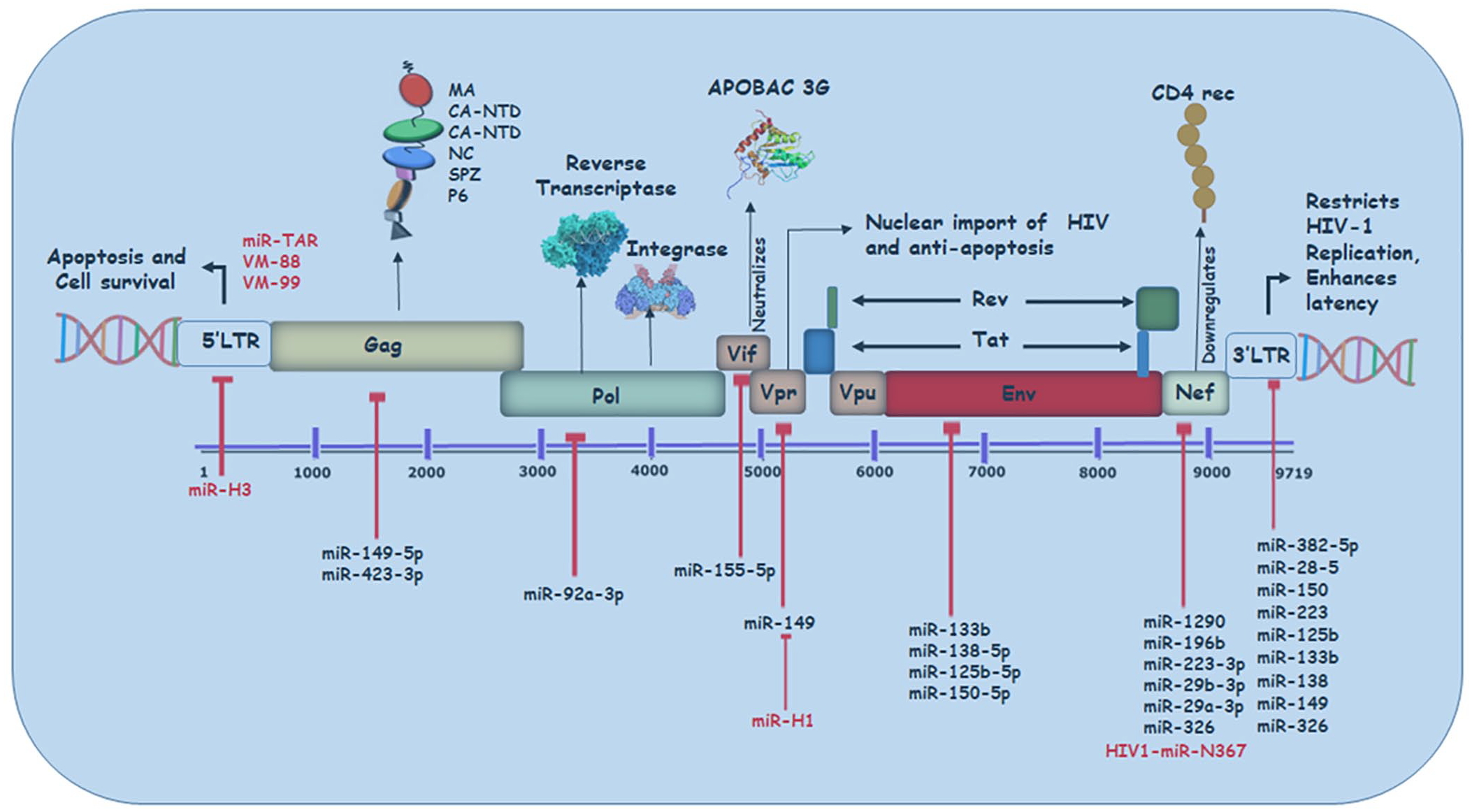 It is found near NF-κB sites in the LTR region. It enhances the infection and cell damage by targeting apoptosis antagonizing transcription factor (AATF), leading to apoptosis. It also targets a few cellular proteins like c-Myc and Dicer.