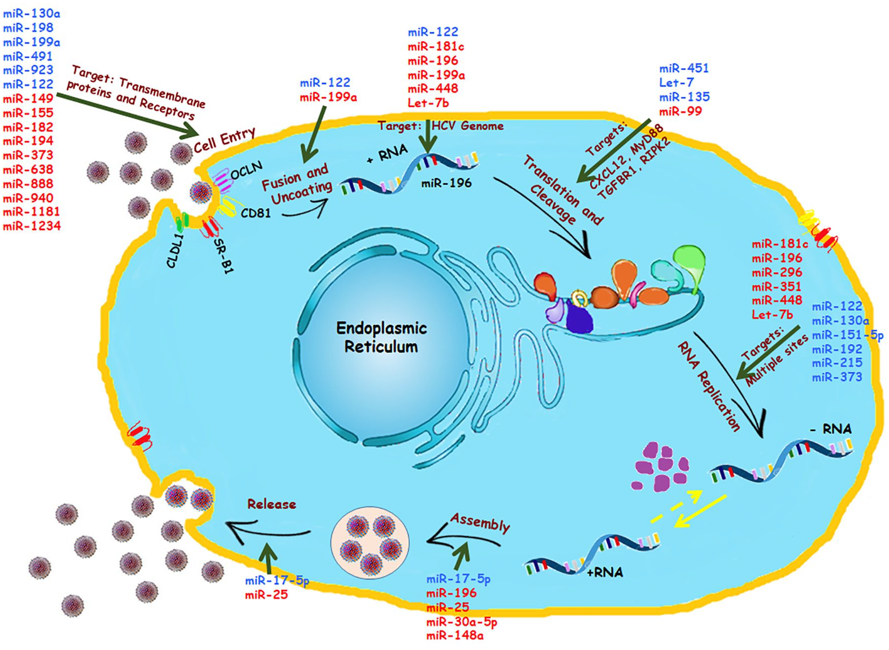 Cellular miRNAs controlling HCV lifecycle: Several miRNAs have been identified for controlling HCV replication and pathogenesis, as illustrated. These miRNAs are known for their targets in the various phases of viral lifecycles: Cell entry, Fusion and Uncoating of viral RNA, Translation and Cleavage of the viral polyprotein, RNA replication, Assembly of the viral genome, and Release of progeny viruses. The upregulated miRNAs are shown in blue, and the downregulated miRNAs are shown in red.