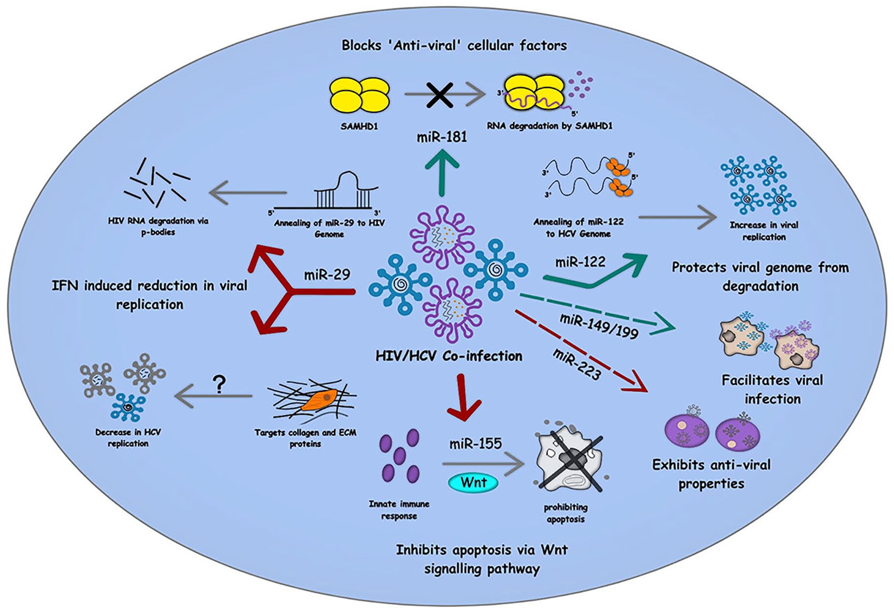 Many times, ‘antiviral’ cellular factors are noticed to be often blocked by miRNAs in order to promote viral infection. Likewise, miR-181 is also seen to anneal and inhibit cellular factor SAMHD1, promoting HIV-1 infectivity. It also holds a strong correlation with HCV viral load along with CD4 + T cells. Some studies claim miR-181 to enhance liver fibrosis. As it is found to be upregulated in HIV/HBV co-infection, hence their role in HIV/HCV co-infection can be a part worth exploring. 100