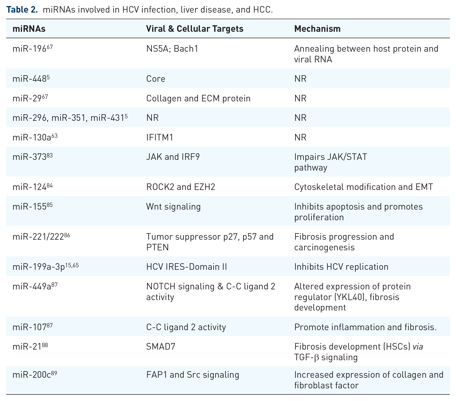 miRNAs involved in HCV infection, liver disease, and HCC.