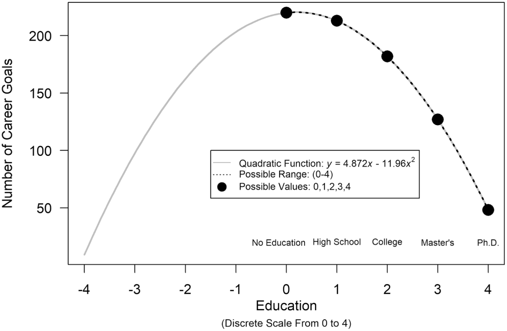Hypothetical example of a significant quadratic term not associated with an actual U shape. Number of goals scored by soccer players during their careers is graphed as a function of the players’ educational achievement. Although the regression analysis yielded a quadratic function, the overall pattern is U shaped only if impossible values of x are included. The R code to reproduce this figure is available at https://osf.io/9uwxg/.