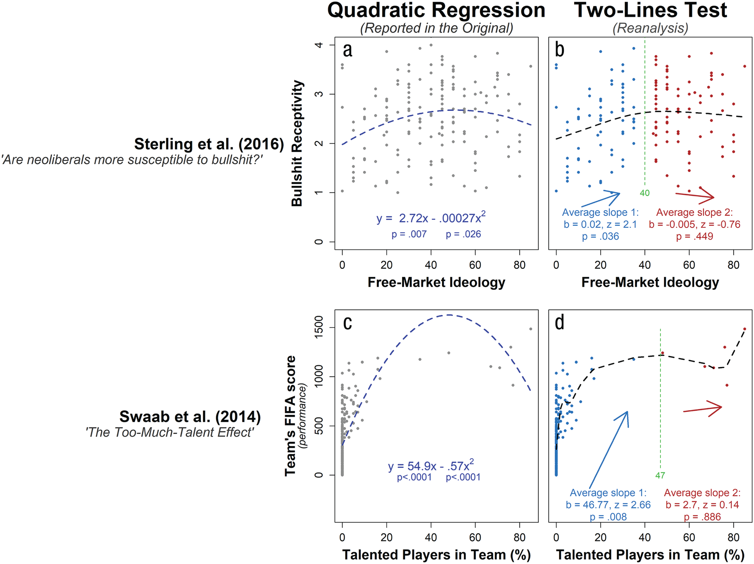 Examples of the difference in results obtained when quadratic regression and the two-lines test are applied to data from published articles. The graphs in the top row (a, b) show results for Sterling, Jost, and Pennycook’s (2016) study on the relationship between ratings of the profundity of a series of vague but seemingly profound statements and endorsement of free-market ideology. The graphs in the bottom row (c, d) show results for Swaab, Schaerer, Anicich, Ronay, and Galinsky’s (2014) study of the relationship between a country’s ranking by the Fédération Internationale de Football Association (FIFA) and the percentage of players on the country’s team who played for a top professional team (e.g., Arsenal). Dots depict individual observations (experimental subjects and country teams in the top and bottom rows, respectively). The horizontal dashed lines depict fitted lines from quadratic regressions in the left column and fitted lines from cubic splines in the right column. The R code to reproduce this figure is available at https://osf.io/3jbzk/.