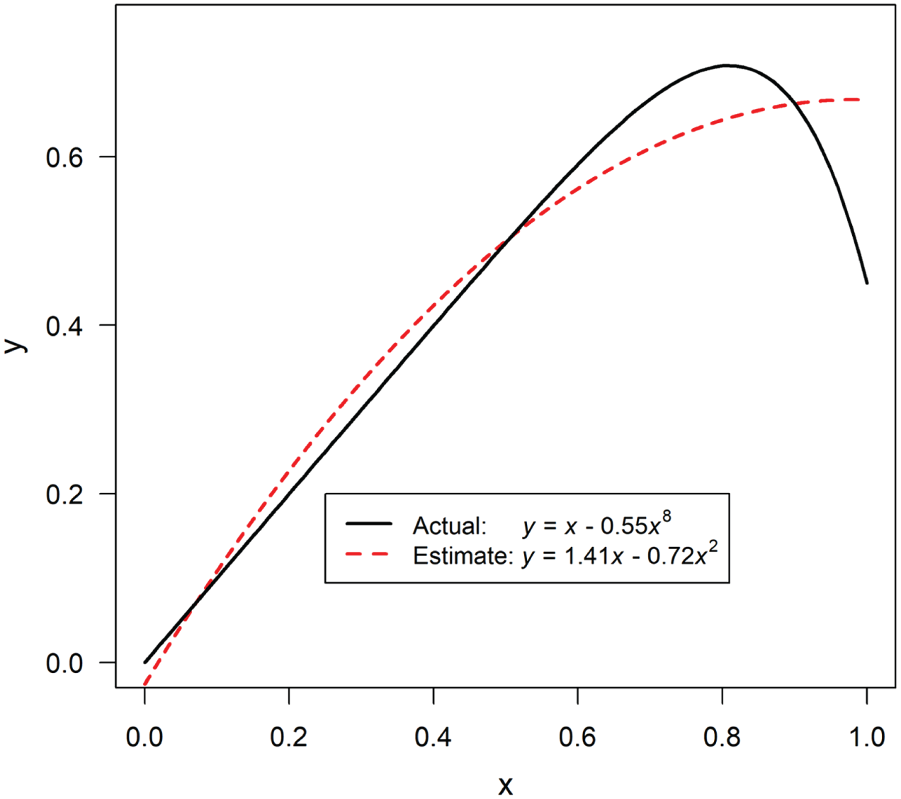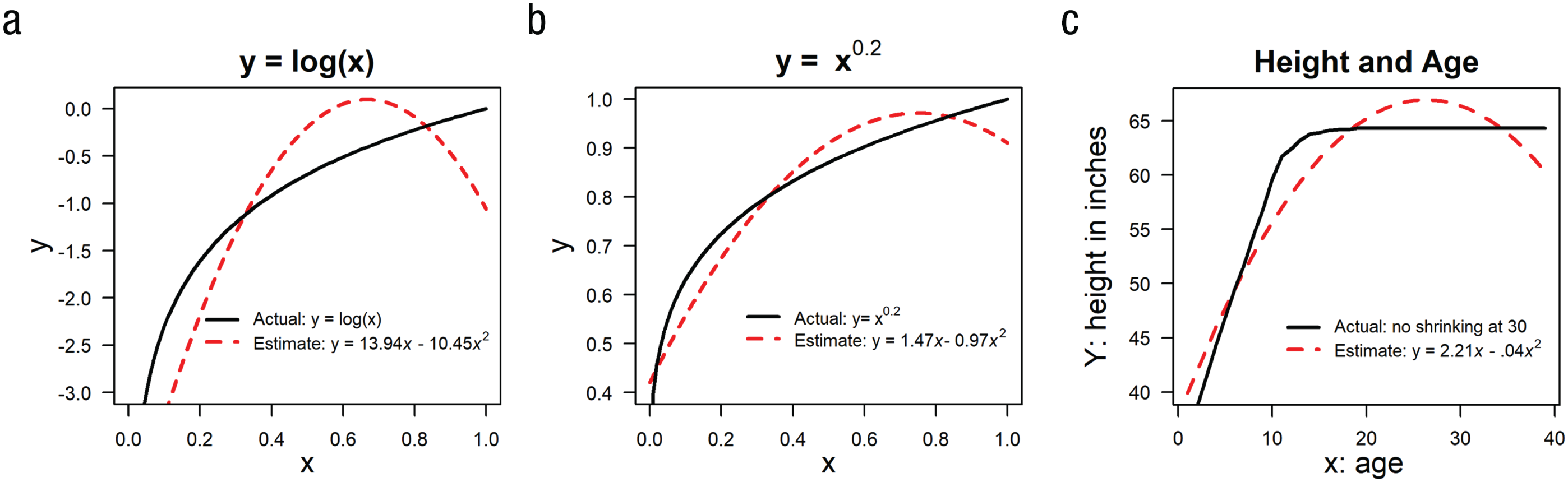 Figure 2a shows a scenario in which the true relationship is y = log(x) and a quadratic regression would result in = 13.94x – 10.45x2. In this equation, the effect of x on y is, dy/dx = 13.96 – 2 * 10.45x. When x = 0.25, the effect of x is positive, 8.735, but in contrast, when x = 0.75, the effect is negative, −1.71. Of course, that result is wrong, as the effect of x is never negative when y = log(x), but it is estimated as negative because we are incorrectly assuming that the relationship is quadratic. Specification error is behind the erroneous conclusion. Figures 2b and 2c provide additional examples of quadratic regression leading to misdiagnosis of a U-shaped relationship.