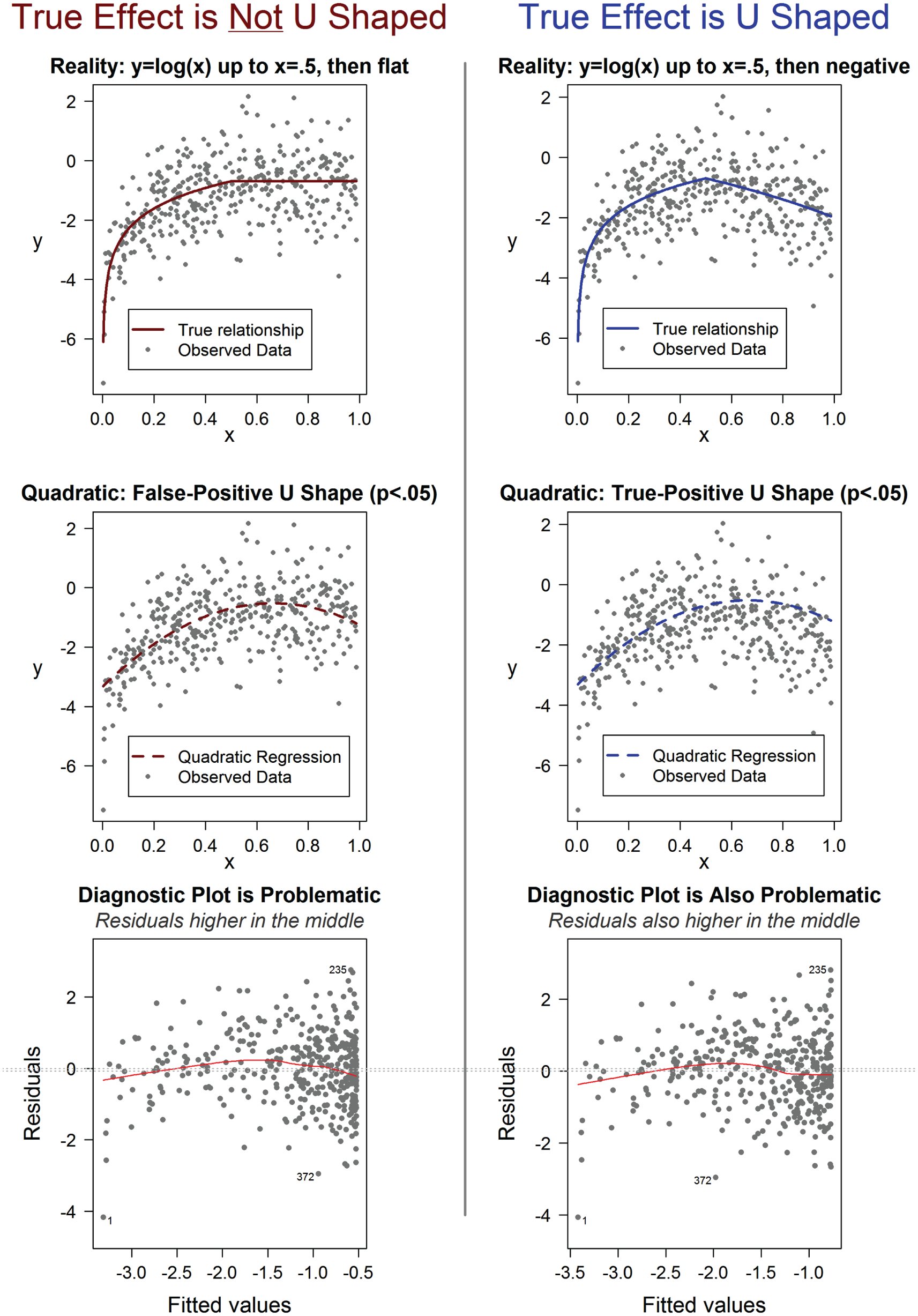 First, in practice, researchers do not follow the recommendations; they do not run, or at least do not report, diagnostic tests on their regression results. Second, regression diagnostics qualitatively assess the general adequacy of the model, but we want to quantitatively assess the adequacy of the conclusion that the relationship is U shaped. Figure 4 illustrates this problem, showing a case in which regression diagnostics for a true-positive and a false-positive U-shaped relationship are indistinguishable from one another.