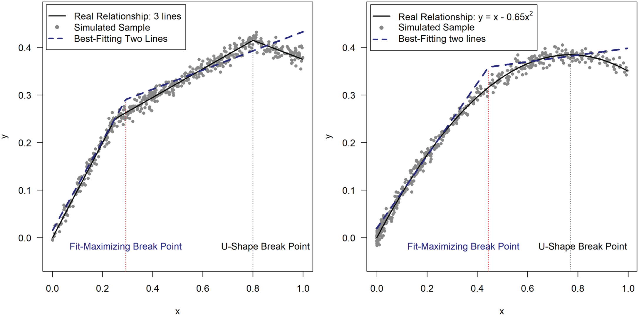We are not fitting two lines with a possible discontinuity between them because we believe the real relationship has that shape and we want to approximate it as well as possible. Rather, we are only estimating regressions to compute average slopes in two sets of x values. Thus, we want to find the break point that answers a different question: If the true relationship is U shaped (i.e., if there really is a sign change for the effect of x on y within the set of observed values), which break point maximizes the chance that we will detect it? Figure 5 illustrates the conflict between these two goals. Moreover, later on, when evaluating the performance of different break points, I show that the break point that maximizes fit provides lower statistical power than that obtained with the proposed Robin Hood procedure.
