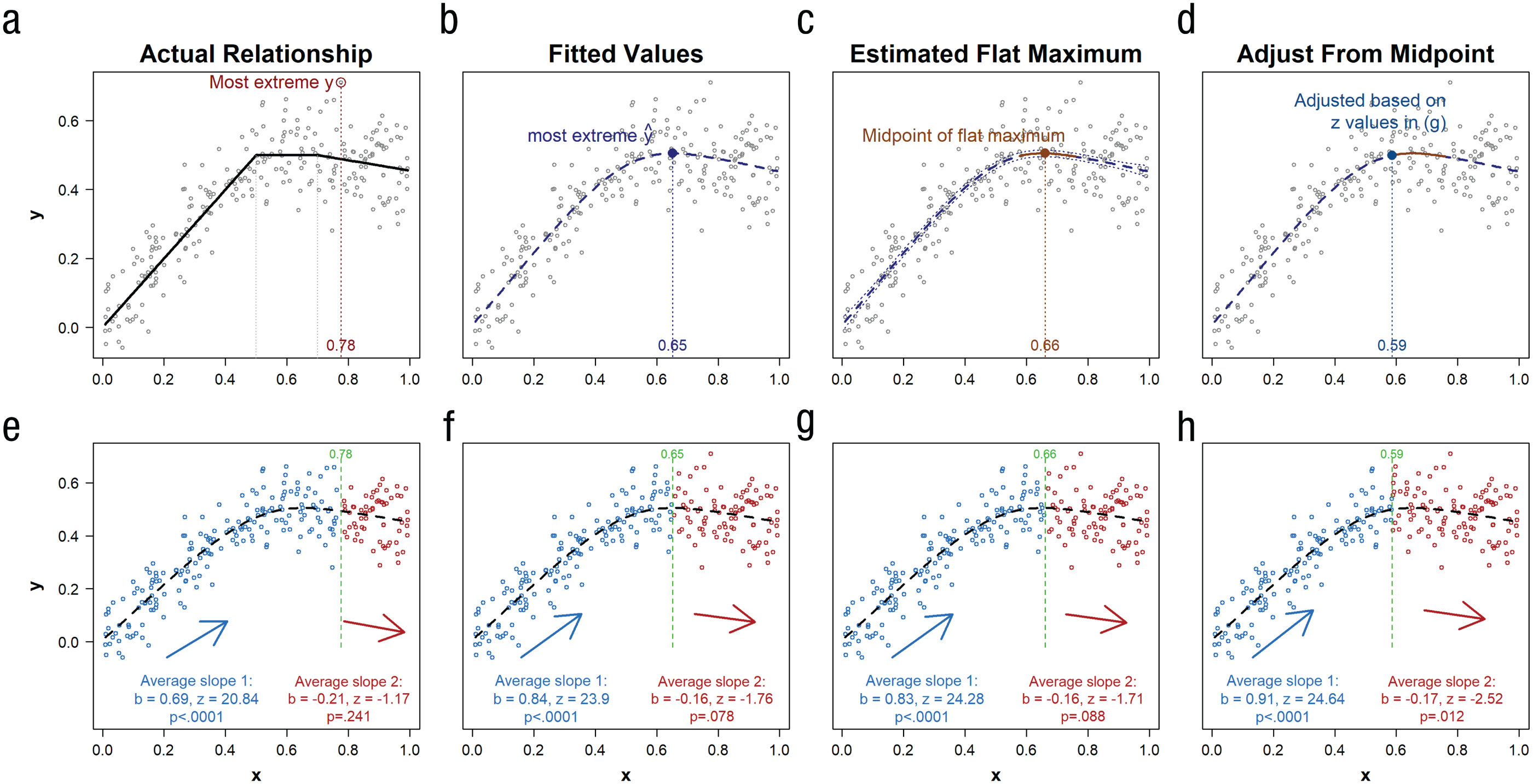 Illustration of four procedures to identify the break point (a–d) and their consequences (e–h). All panels are based on the same random sample (each circle represents a data point); the true relationship between x and y is shown by the solid line in (a). The effect of x on y is positive up to x = 0.5, flat up to x = 0.7, and negative onward. The top row shows four alternative ways to set the break point: It may be the x value associated with (a) the most extreme y value; (b) the most extreme fitted value, ; (c) the midpoint of the flat maximum; or (d) the solution provided by the Robin Hood algorithm. The bottom row shows the resulting two-lines regressions. The fitted values in (b) through (d) were obtained by smoothing the scatterplot with a cubic spline. The flat region in (c) and (d) is where are within 1 SE of the maximum . The R code to reproduce this figure is available at https://osf.io/zdert/.