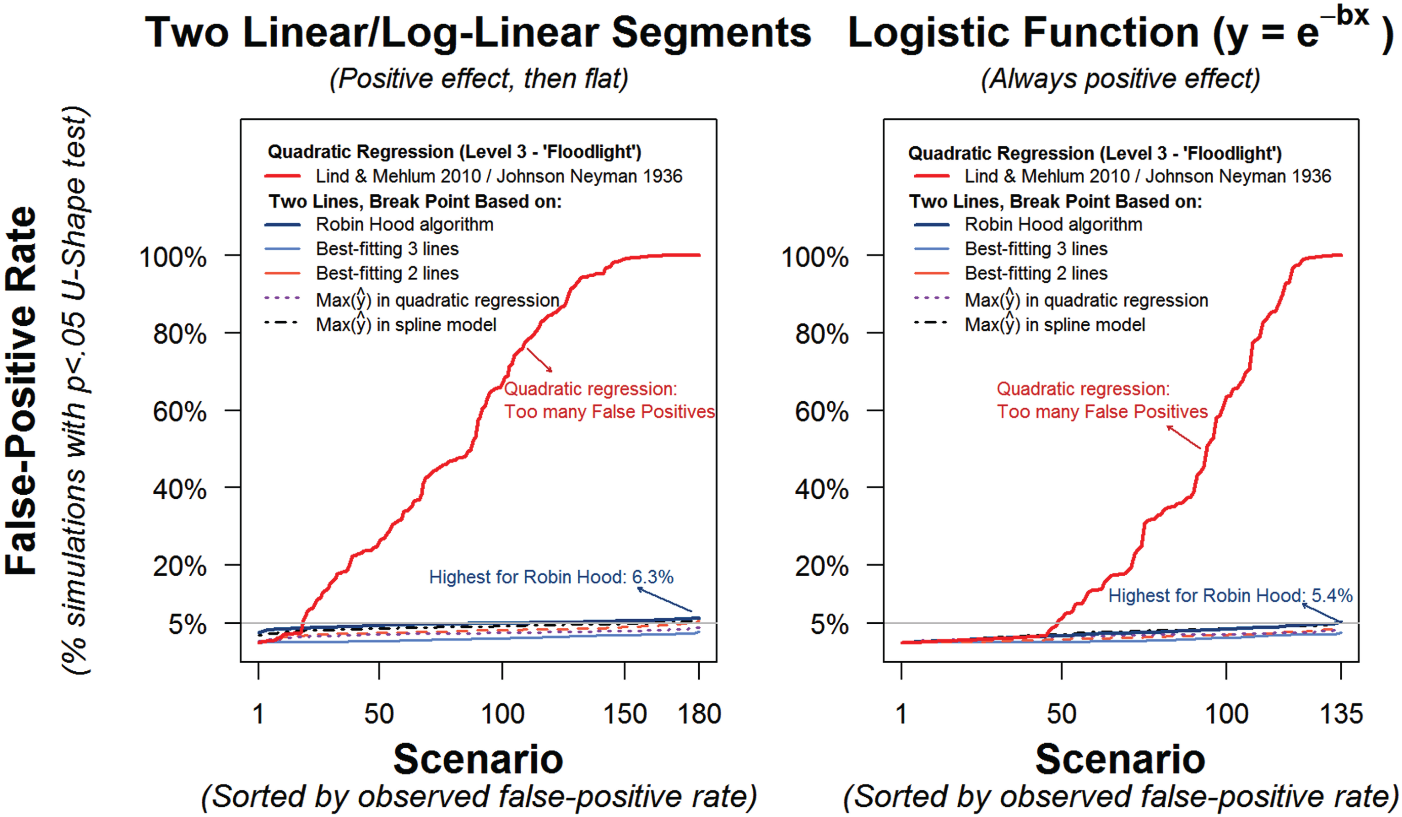Figure 7 shows results for false-positive detection of a U shape in simulated scenarios. The left panel shows results obtained with six testing procedures (including the Robin Hood algorithm) when the true relationship would be expected to lead to the most false positives: an initial strong effect followed by a long flat segment. The right panel shows results for the same testing procedures for scenarios in which the data followed a (monotonic) logistic function. For the quadratic-regression approach, I report results for its most sophisticated version, the procedure proposed by Lind and Mehlum (2010), which is equivalent to that proposed by Spiller et al. (2013), Miller et al. (2013), and Aiken and West (1991).11