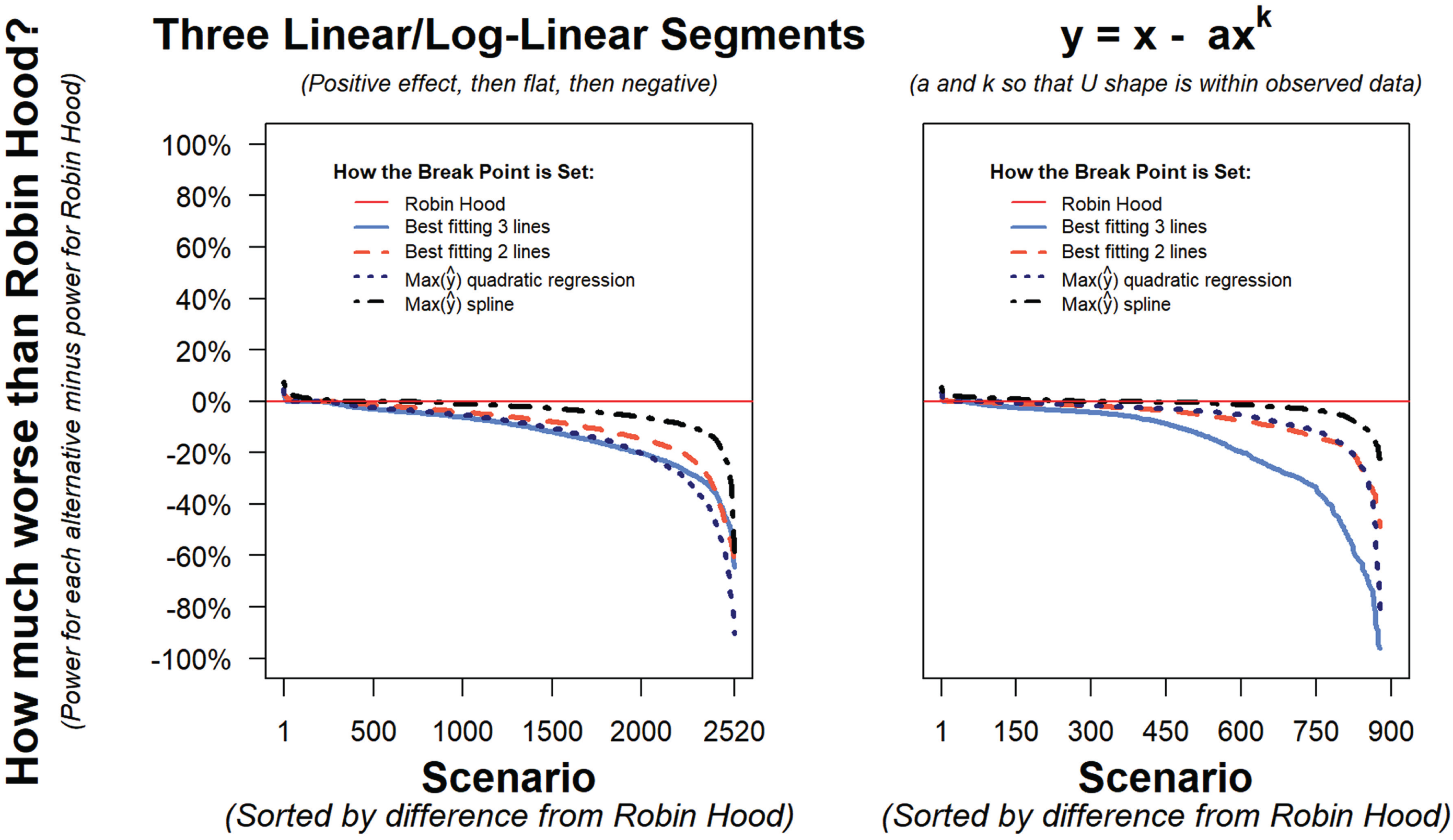 Figure 8 moves on to false negatives, comparing estimates of statistical power obtained using the Robin Hood algorithm to set the break point with estimates of power obtained using four alternative approaches to setting the break point. Results are shown for two general functional forms (Fig. 9 shows examples of the individual simulations behind the left panel of Fig. 8). Because quadratic regressions yielded unacceptably high false-positive rates, Figure 8 does not include power results for that approach. For statistical inference, we should select the most powerful test among those that satisfy the nominal false-positive rate. For example, if the test consisted of a coin that read “U shape” on either side, flipping the coin would lead to 100% power, but this is not a statistical test we would want to use.
