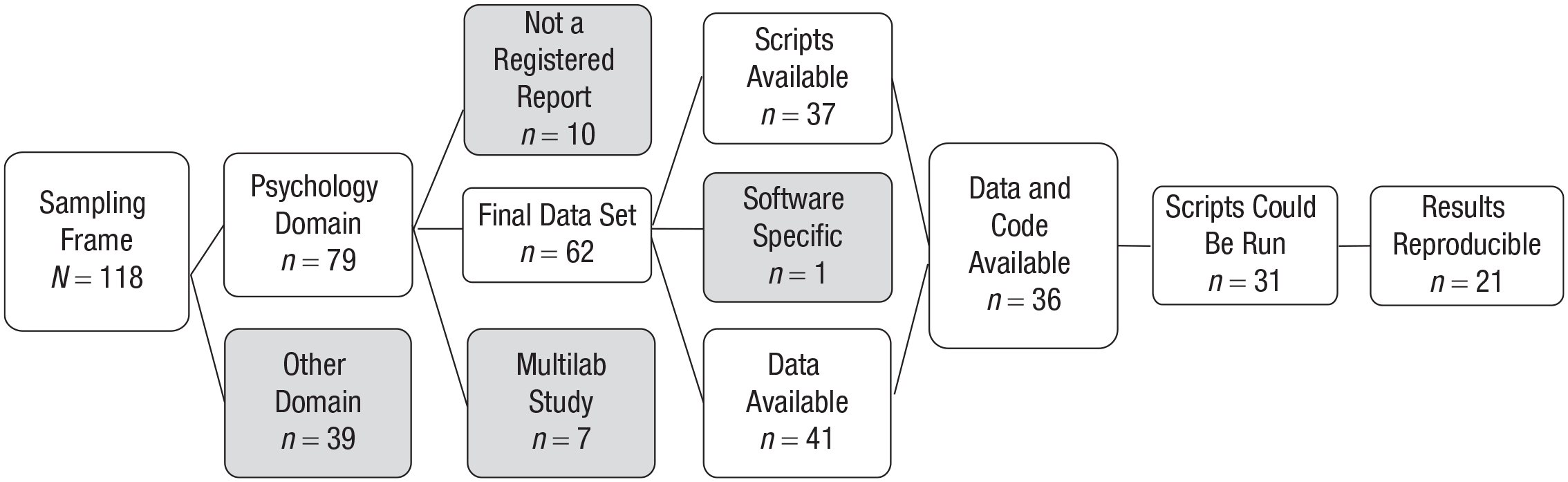 To find Registered Reports published in the psychology literature, we drew from a database of Registered Reports maintained by the Center for Open Science. 1 At the start of this project (June 5, 2018), this database consisted of 118 published Registered Reports from 2014 to 2018. Seventy-nine of these were published in the psychology literature (see the flowchart in Fig. 1 for the number of articles that met each of the criteria in this study). We limited our analysis to studies performed by single groups, because such articles are most representative of the researchers’ current work, and excluded 7 large-scale collaborations in which dedicated team members were responsible for making analyses reproducible, such as Registered Replication Reports (Hagger et al., 2016) and Many Labs projects (R. A. Klein et al., 2014; R. A. Klein et al., 2018). Upon further inspection of the 72 articles left in the data set, we found that 10 were not formally Registered Reports. This left 62 articles in our sample. When evaluating whether we could reproduce the original results, we limited ourselves to statistical software packages that we had experience with: R (R Core Team, 2017), SPSS, Python (Python Software Foundation, http://www.python.org), MATLAB (The MathWorks, Natick, MA), and JASP (jasp-stats.org); 1 additional study was excluded because it required expertise in software packages we were not trained in (e.g., dedicated software for electroencephalography, EEG).